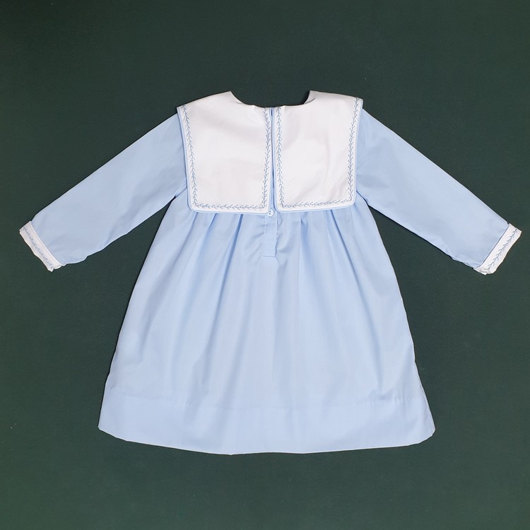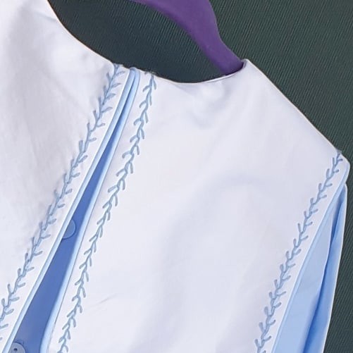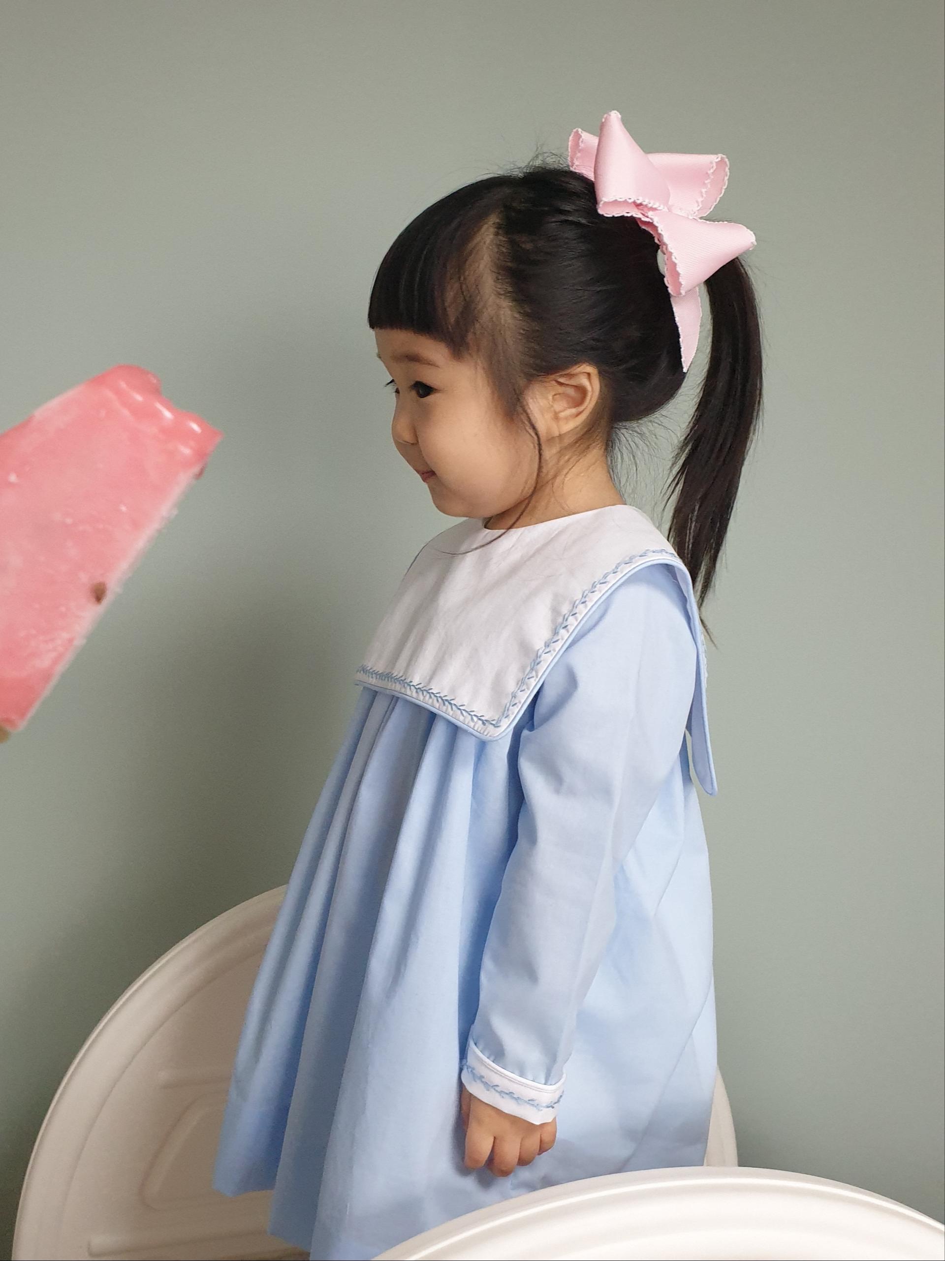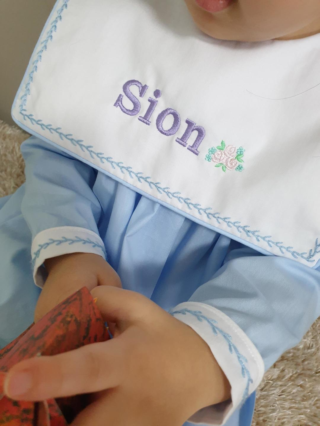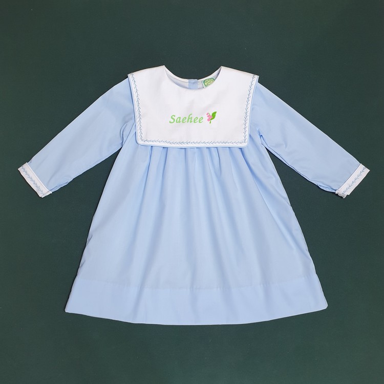 하늘색 바디에 하얀색 스퀘어 카라, 투톤으로 제작되었으며, 나뭇가지 모양의 하늘색 손자수가 카라와 소매 끝에 정성스럽게 수 놓아져 있는 제품입니다. 스퀘어 카라 부분에는 아이의 이름 혹은 태명, 애칭 등을 수 놓으면 세상에 하나 뿐인 우리 아이만을 위한 꼬까옷이 완성됩니다 ^^