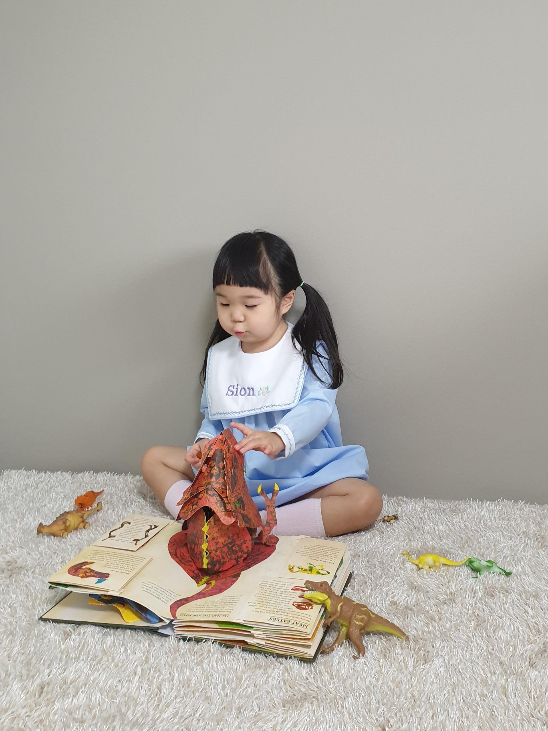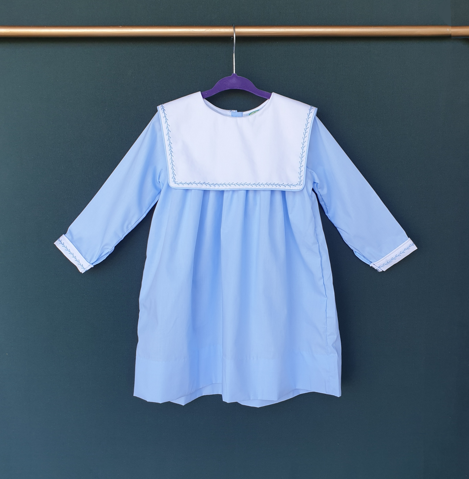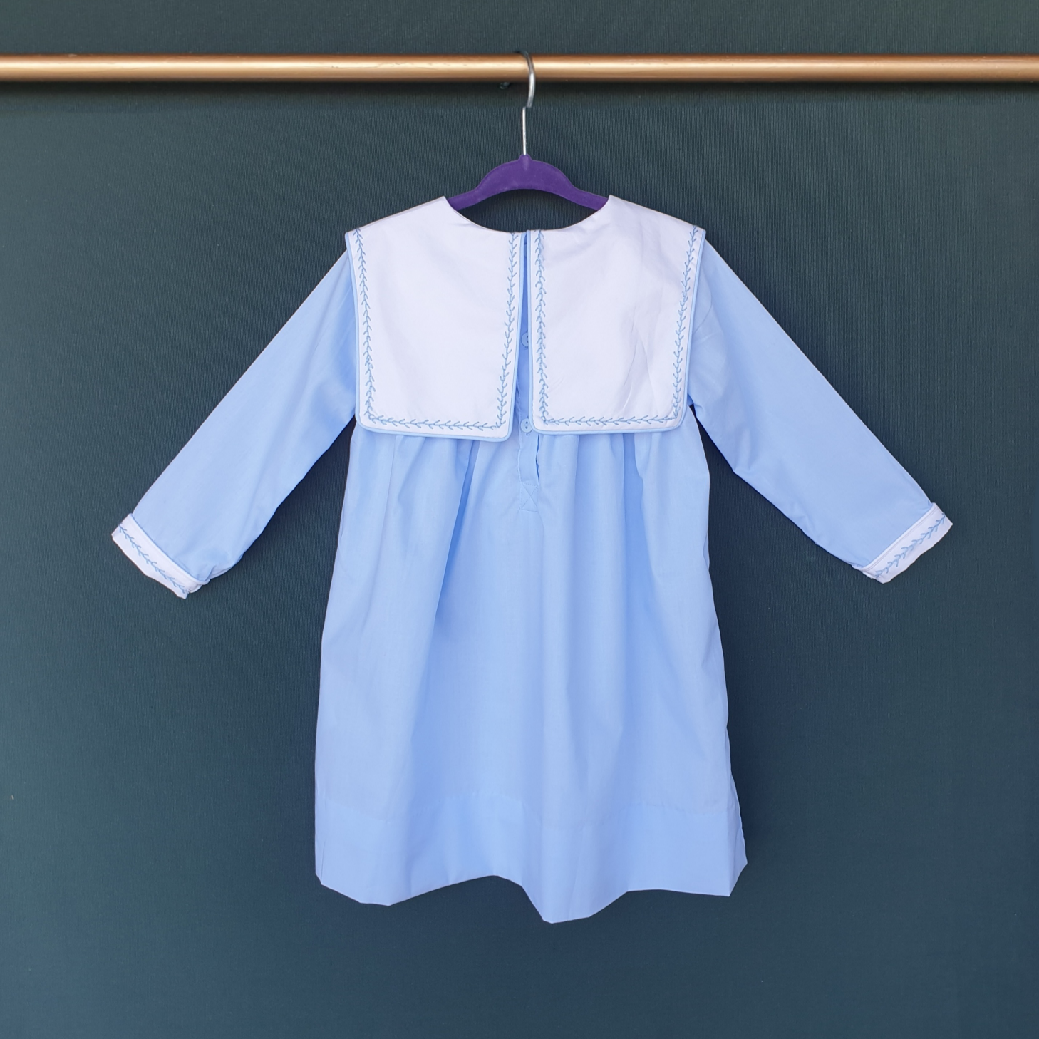 하늘색 바디에 하얀색 스퀘어 카라, 투톤으로 제작되었으며, 나뭇가지 모양의 하늘색 손자수가 카라와 소매 끝에 정성스럽게 수 놓아져 있는 제품입니다. 스퀘어 카라 부분에는 아이의 이름 혹은 태명, 애칭 등을 수 놓으면 세상에 하나 뿐인 우리 아이만을 위한 꼬까옷이 완성됩니다 ^^