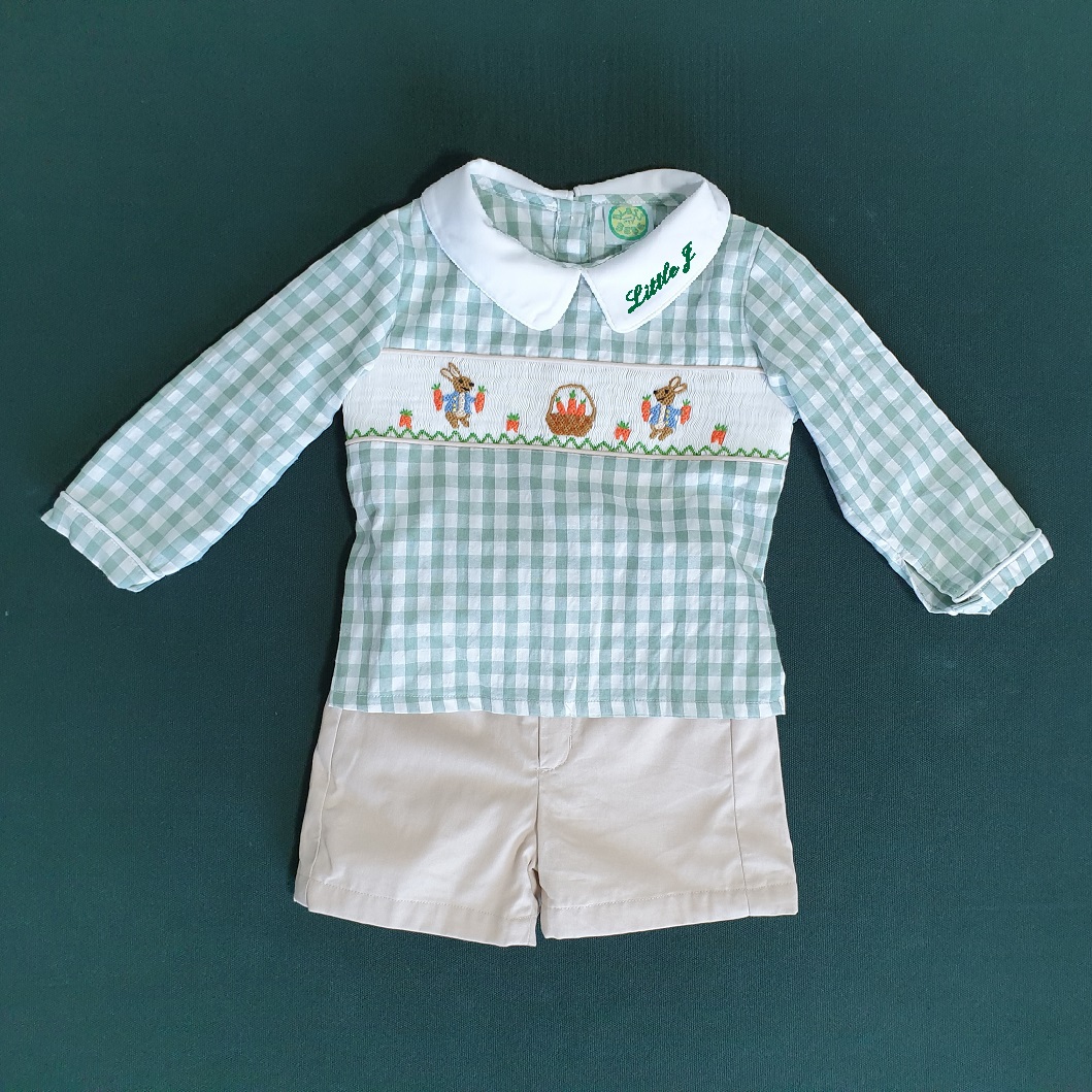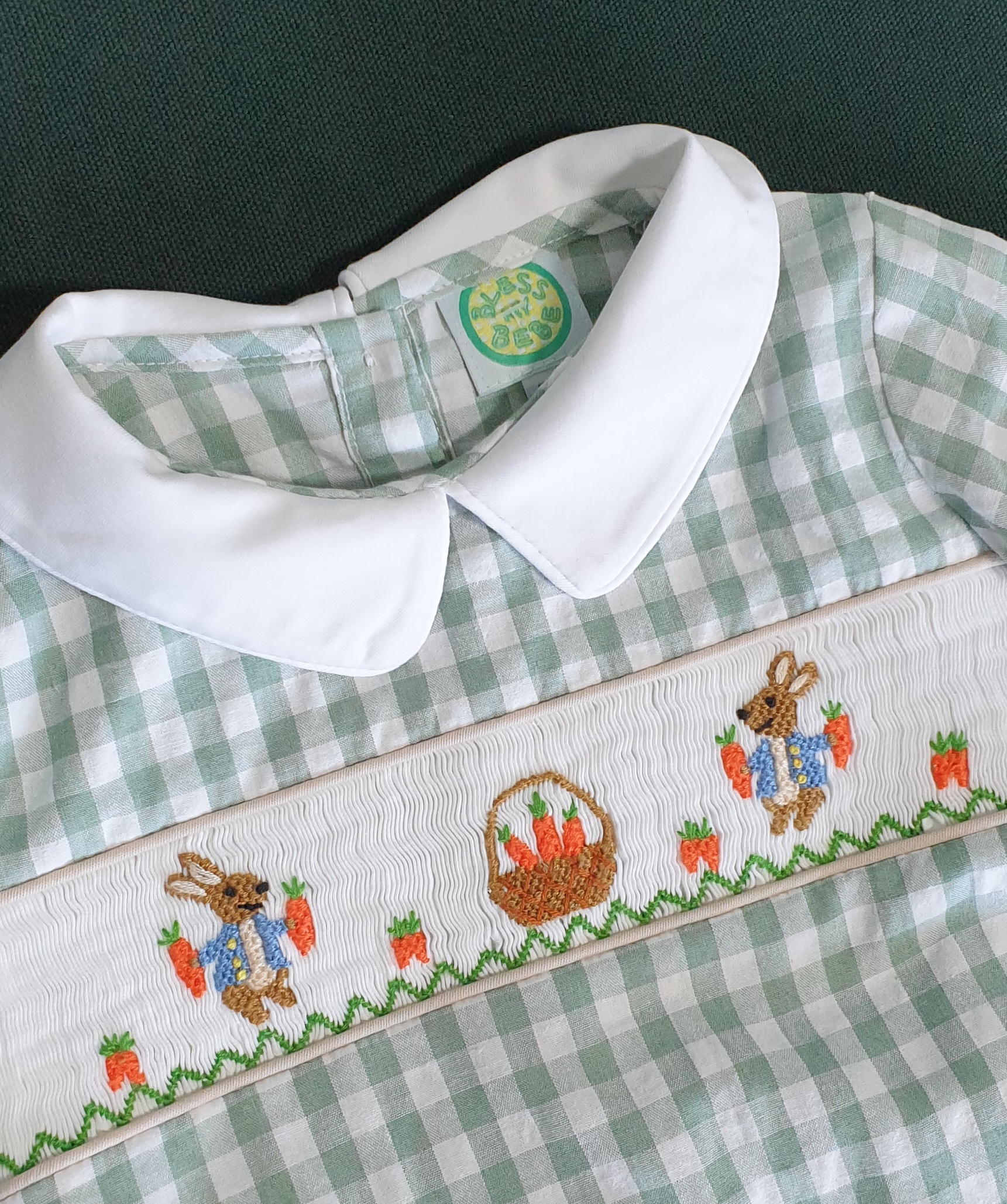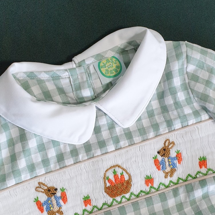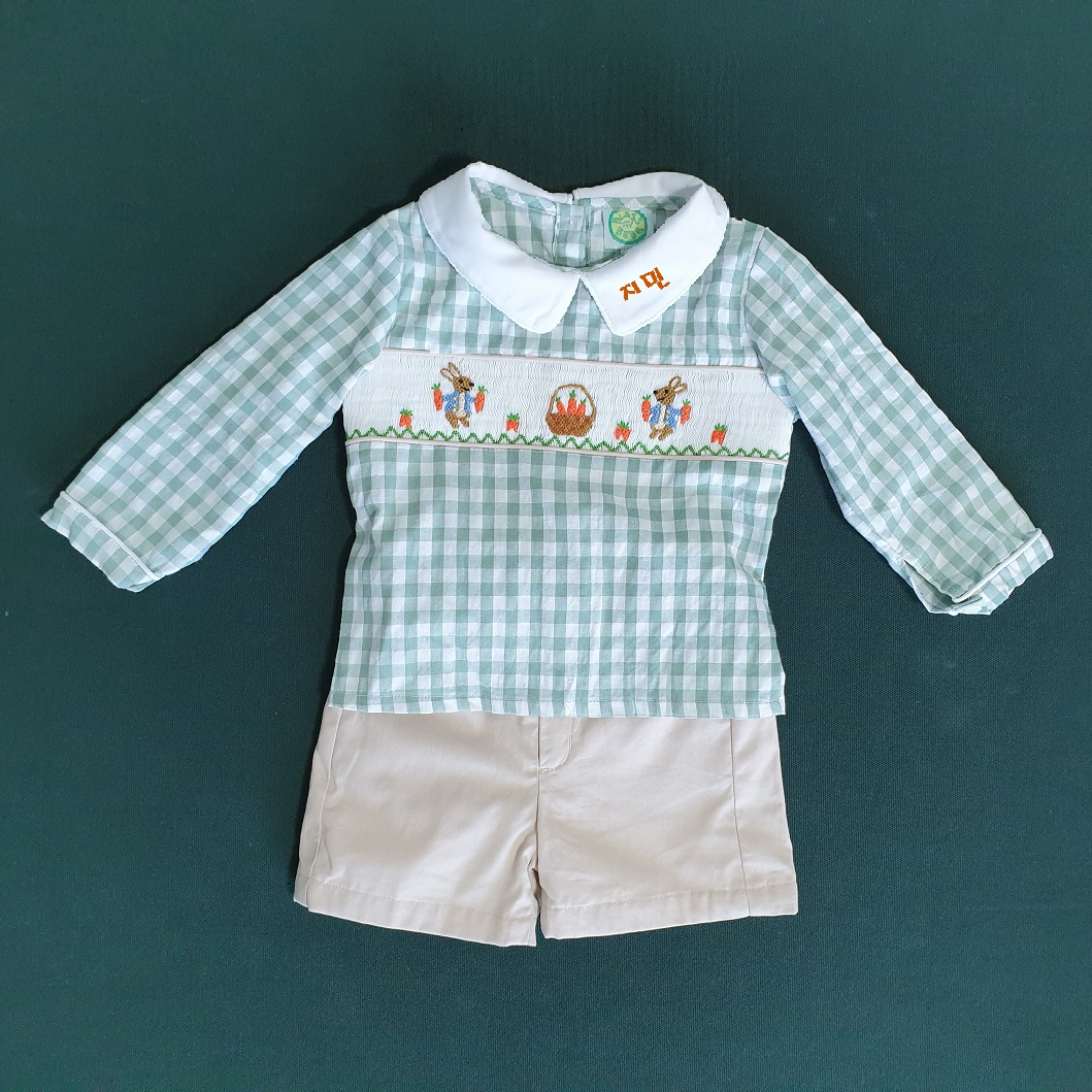상의 - dark sea green 패브릭에 귀여운 토끼와 당근들이 손자수로 정성스럽게 수 놓아져 있습니다.