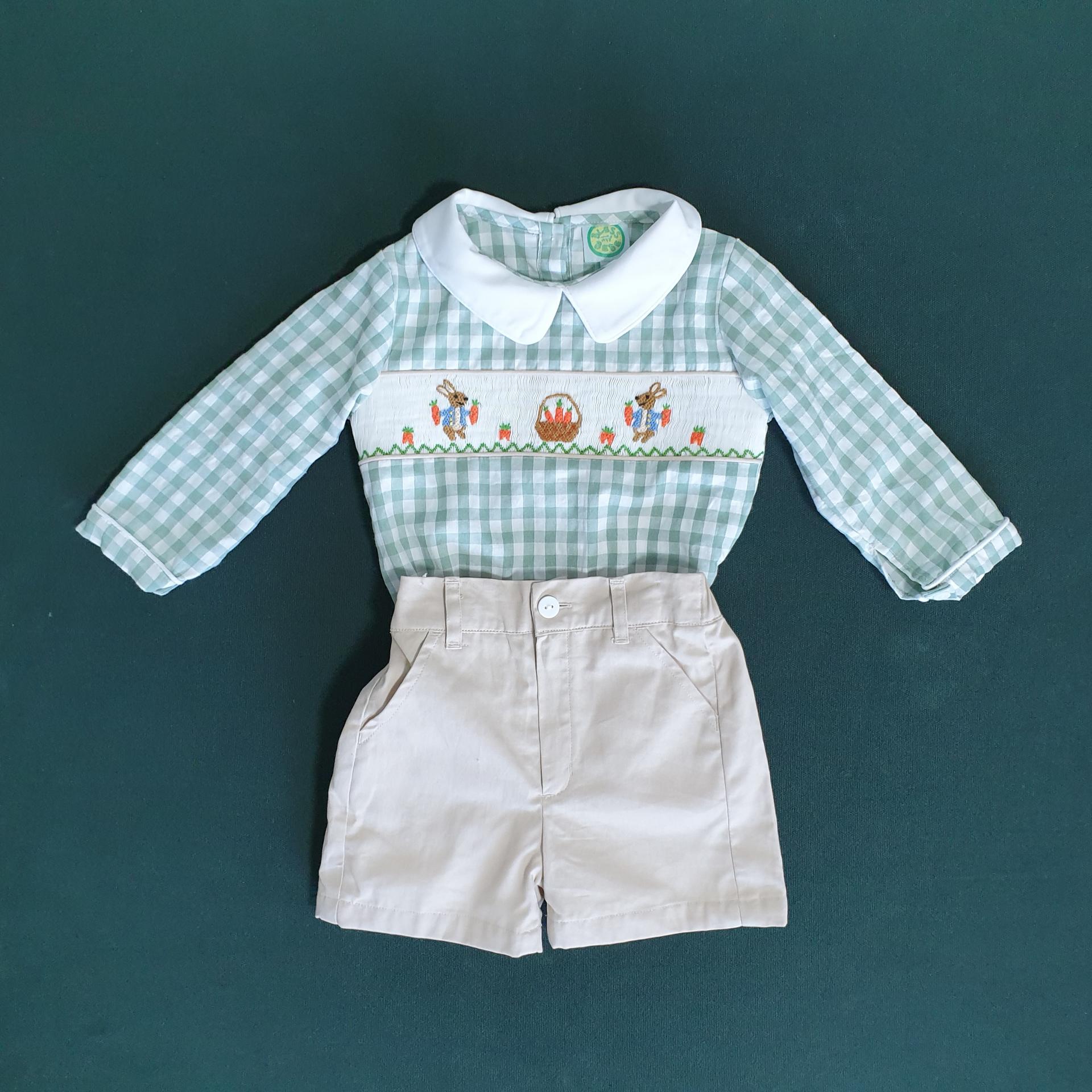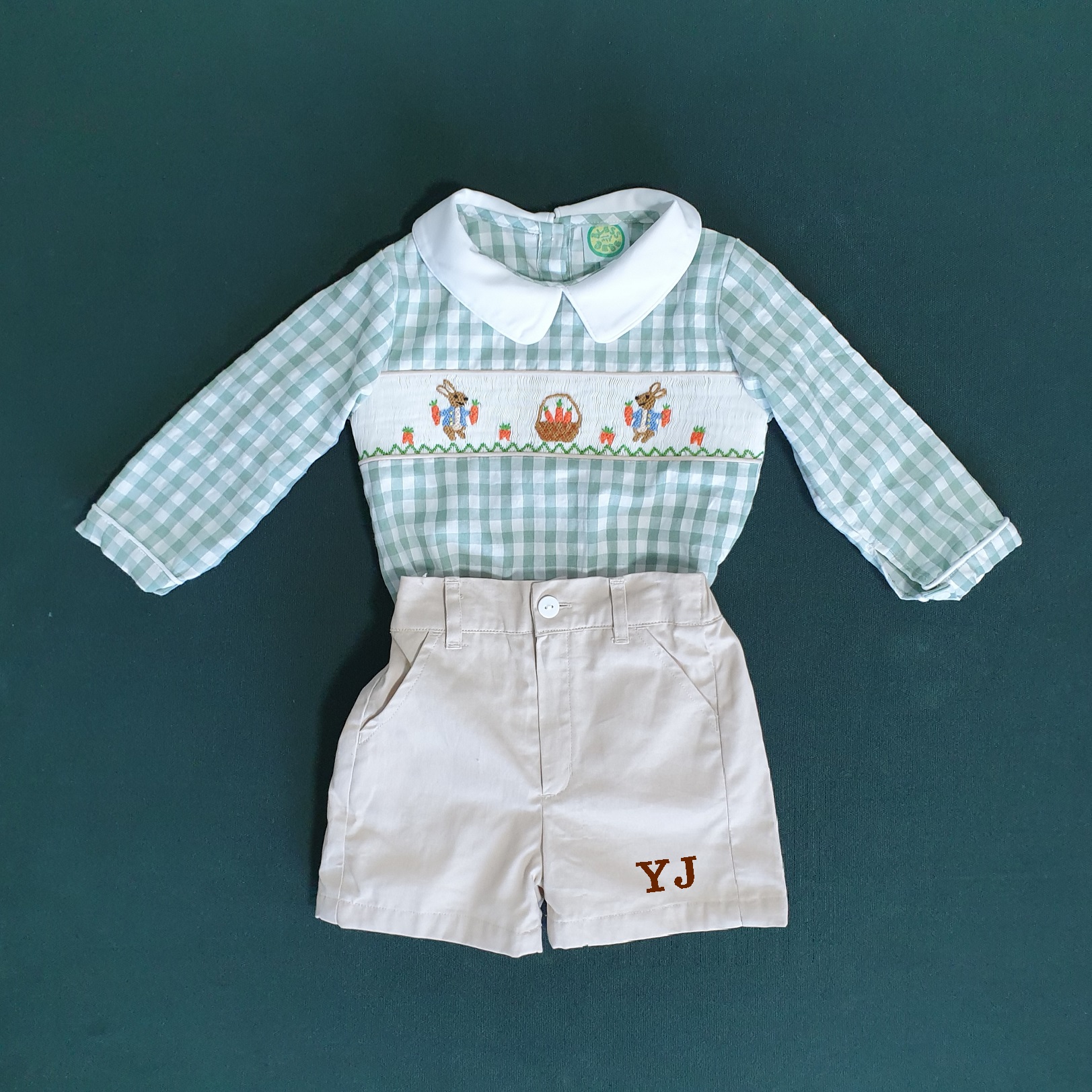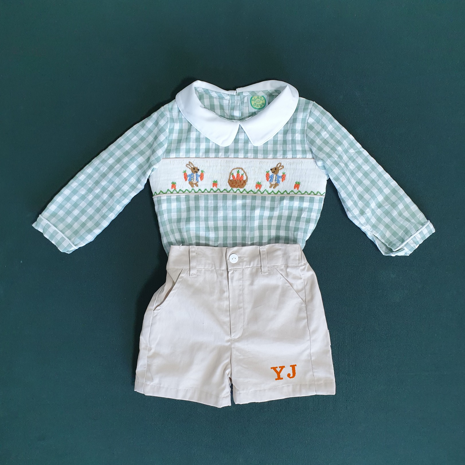 상의 - dark sea green 패브릭에 귀여운 토끼와 당근들이 손자수로 정성스럽게 수 놓아져 있습니다.