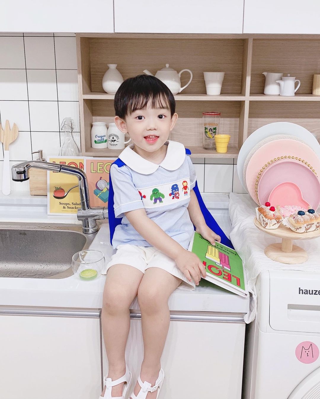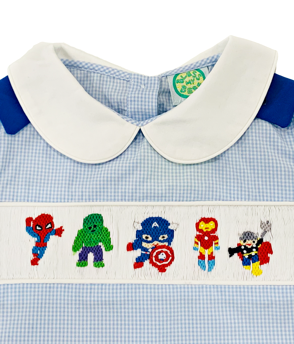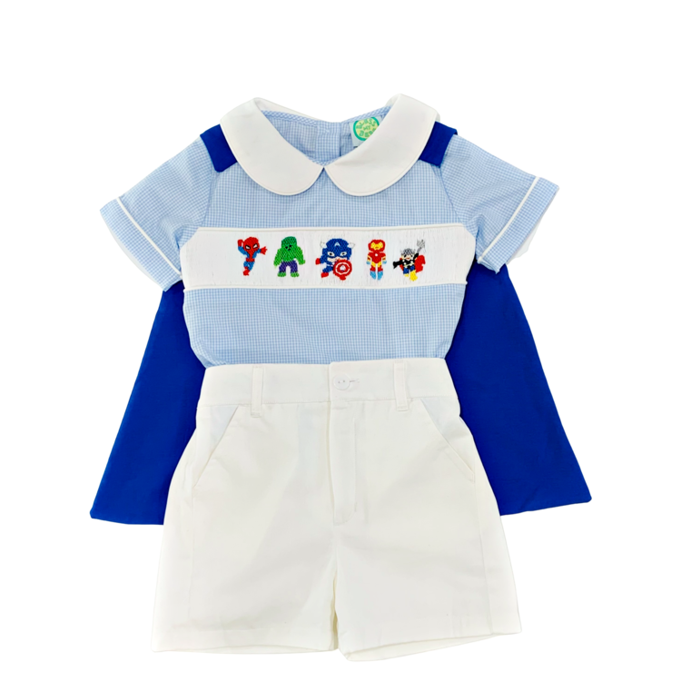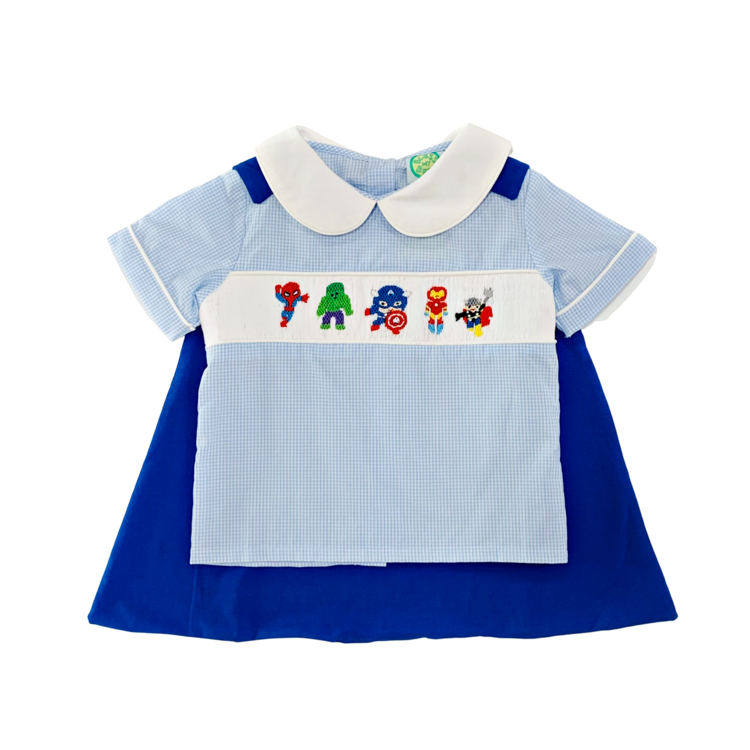 상의 - 블루 스몰 깅엄체크 패브릭에 귀엽고 용감한 히어로즈들이 손자수로 정성스럽게 수 놓아져 있습니다.