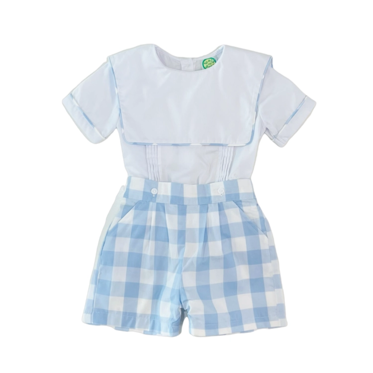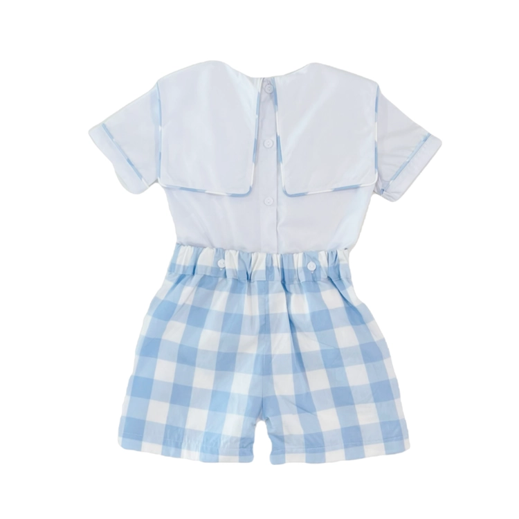 아이의 이름, 별명 혹은 애칭 등을 크게 새기는 셔츠와 라지 블루 깅엄 패브릭 반바지로 구성되어 있는 제품입니다. 셔츠와 바지를 연결하는 단추가 있어 활동할때에도 셔츠가 빠지지 않게 방지해 줍니다.