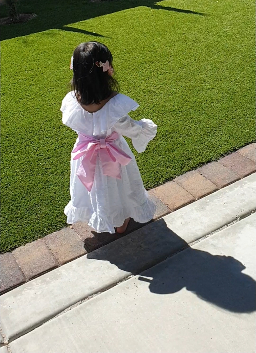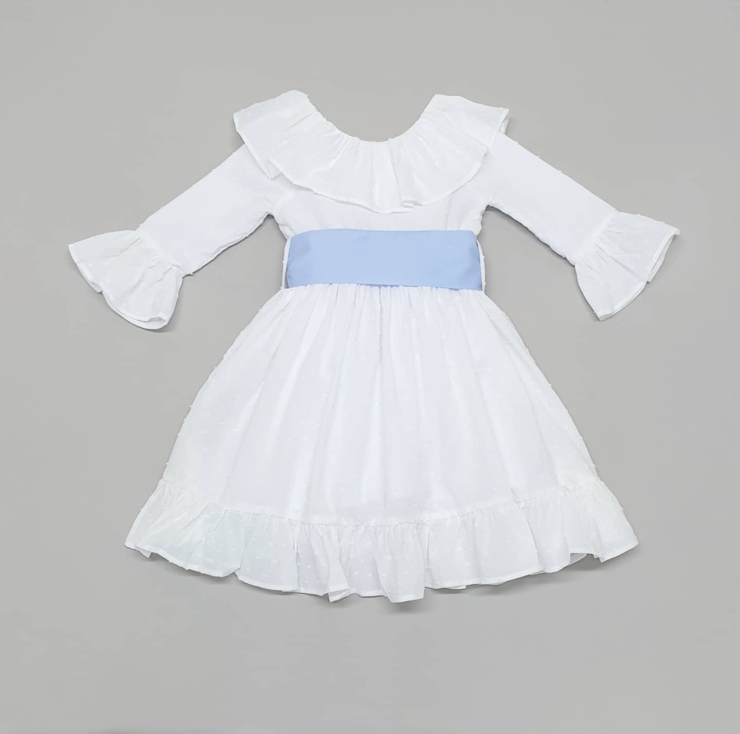 스위스 닷 화이트 드레스에 블루, 핑크 허리 리본 두 개가 모두 포함된 상품