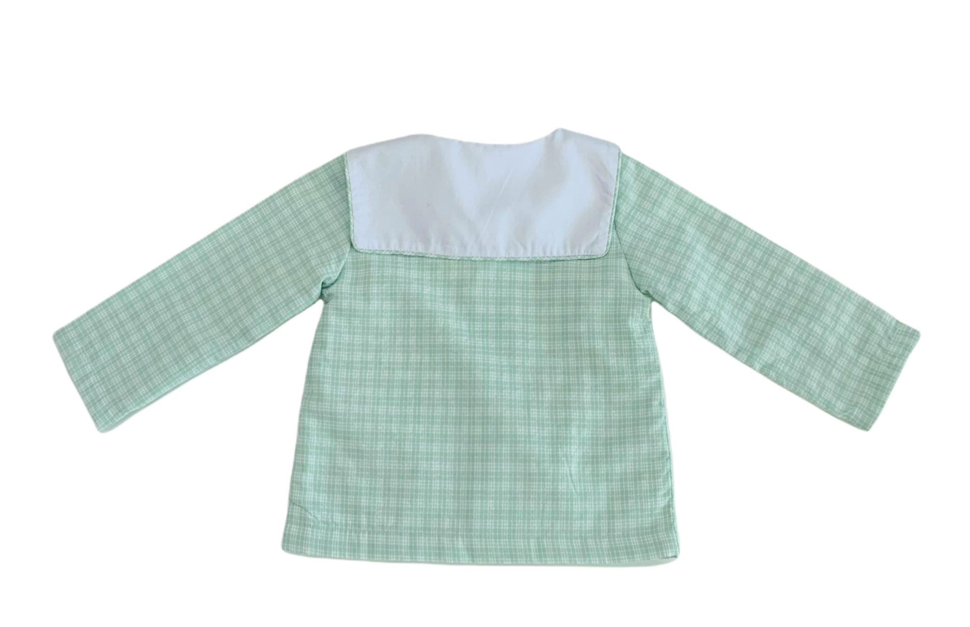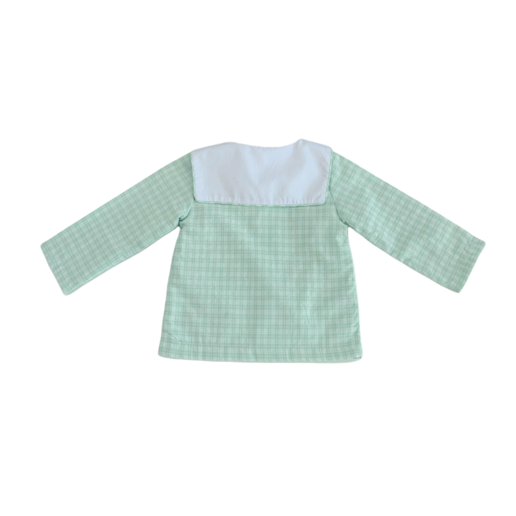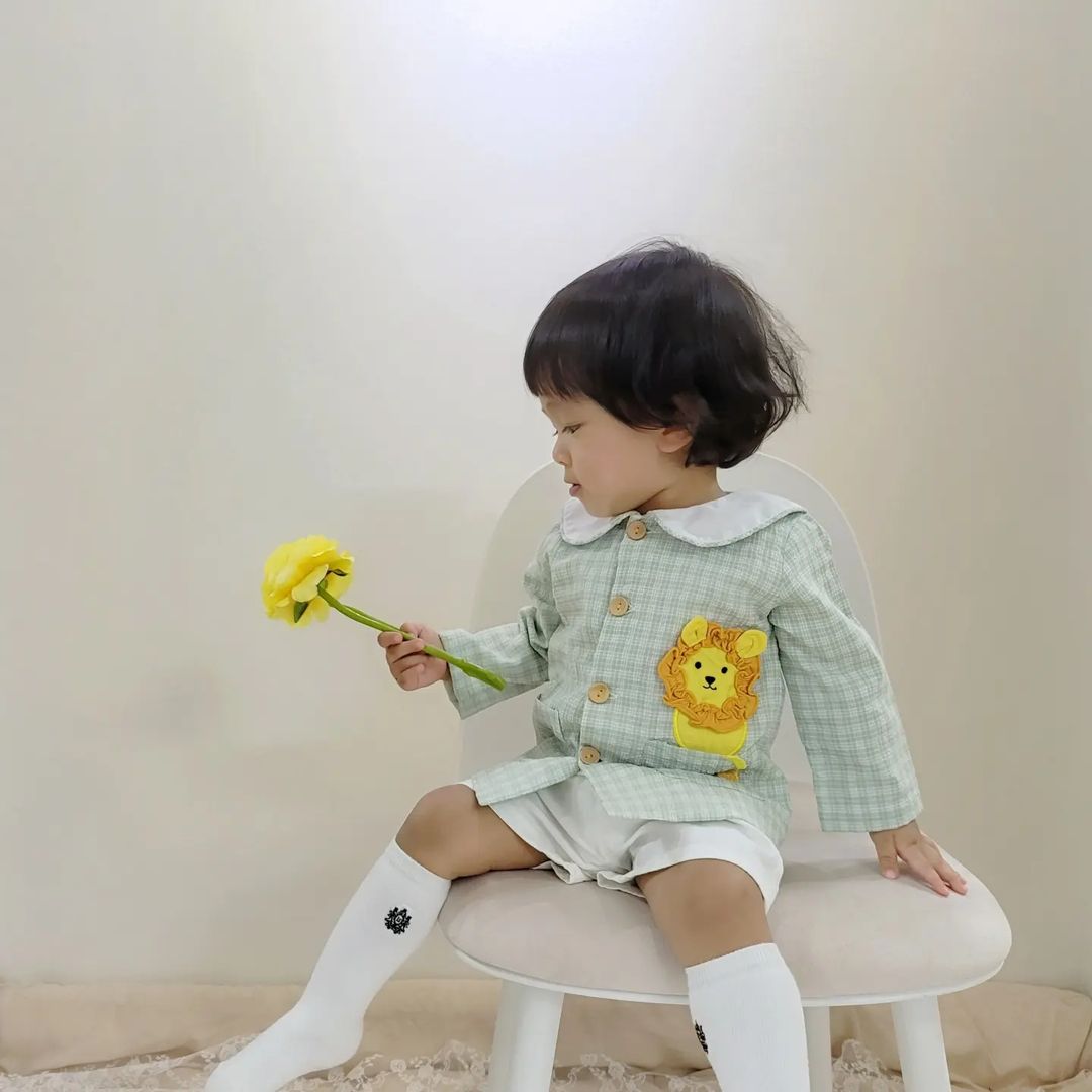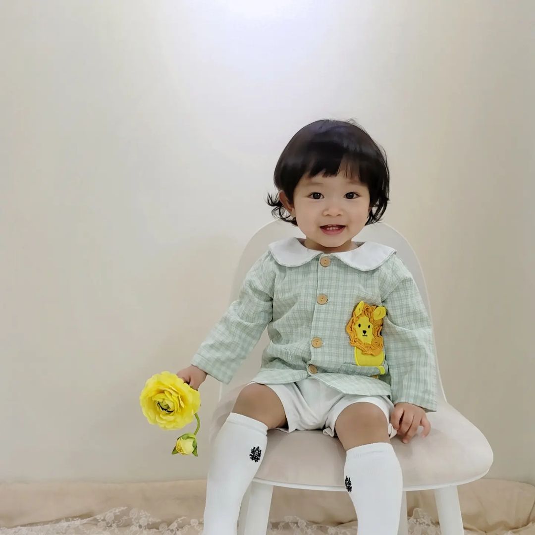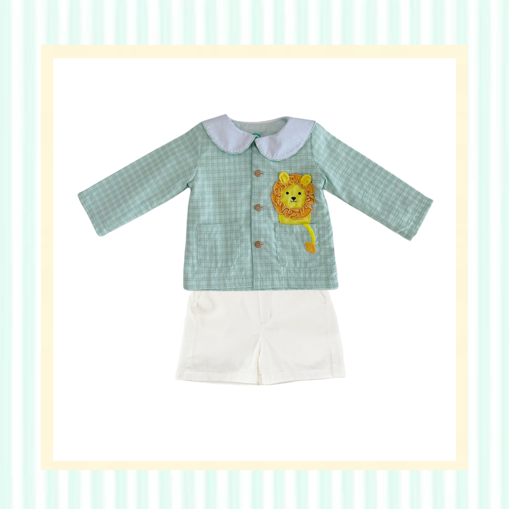 민트 체크 패브릭 셔츠자켓 스타일로 주머니 위쪽에 귀여운 사자 아플리케를 놓고 주머니에는 사자 꼬리가 이어지게 하여 귀여움을 더 했습니다.