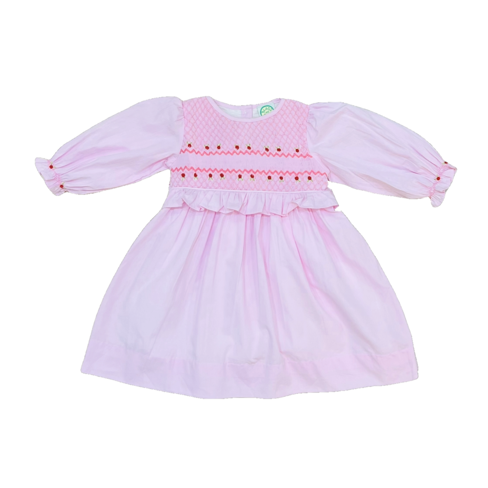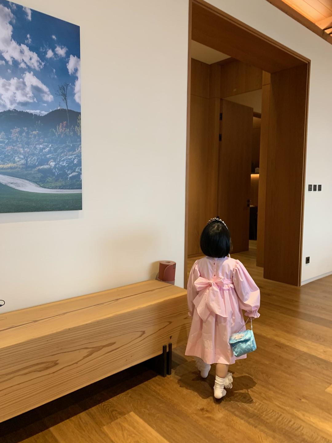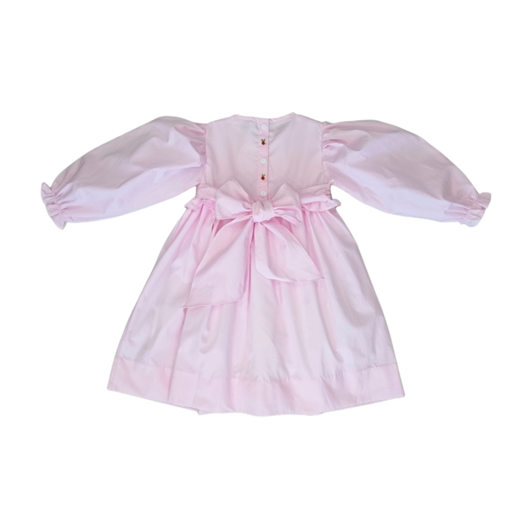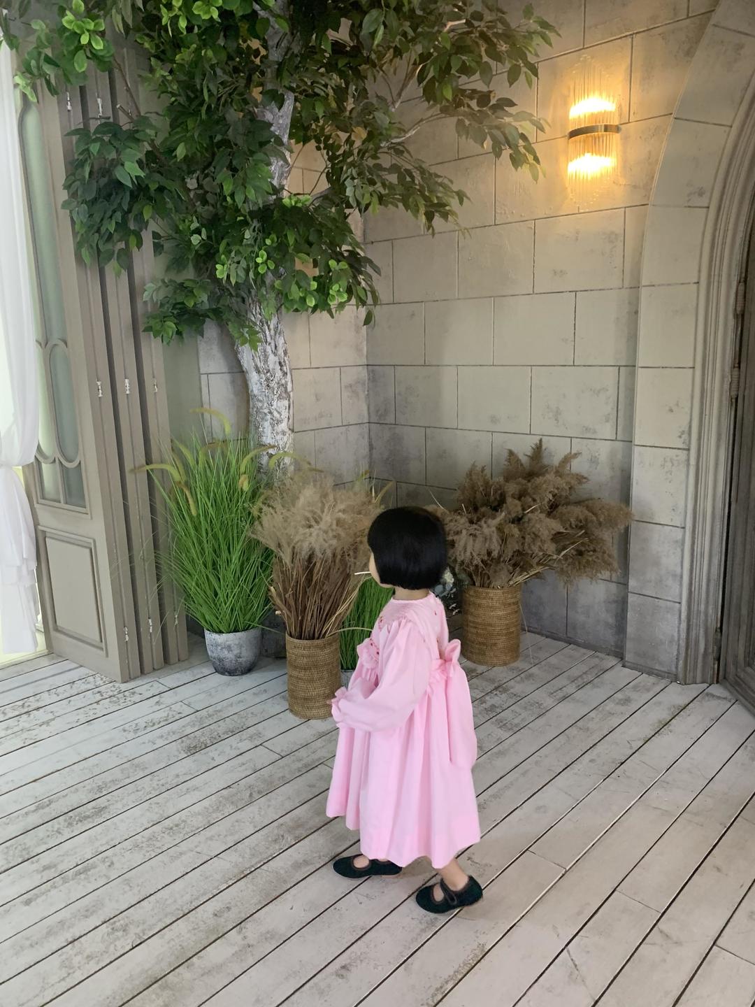사랑스런 핑크 패브릭으로 가슴부분과 소매 끝에는 앙증맞은 빨간 꽃 모양의 손자수가 정성스럽게 수 놓아져 있습니다.