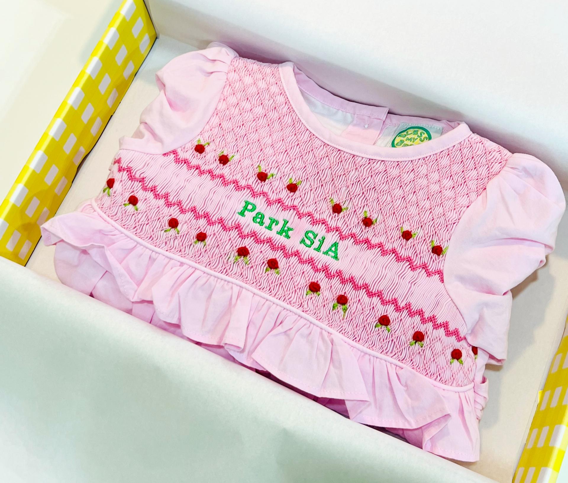 가슴쪽 스모크 부분에 아이의 이름 혹은 태명, 애칭 등을 수 좋으면 세상에 하나 뿐인 우리 아이만을 위한 꼬까옷이 완성됩니다 ^^