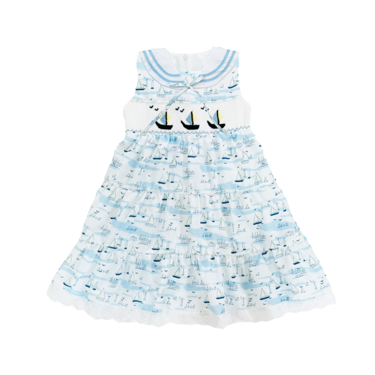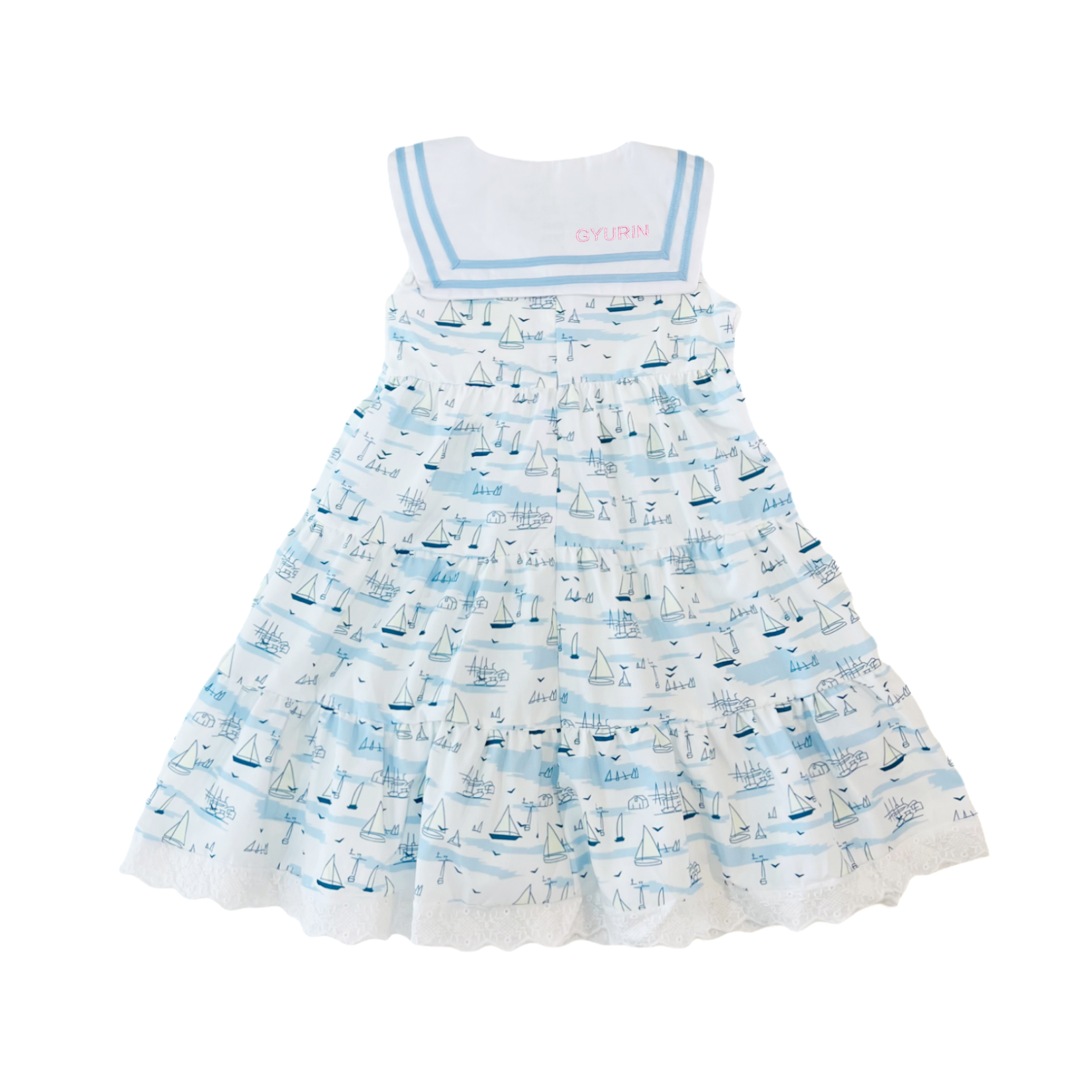 화이트 바탕에 바다 위 배들의 풍경을 담은 패브릭에 보트와 갈매기 그리고 파도가 손자수로 정성스럽게 수 놓아져 있습니다.