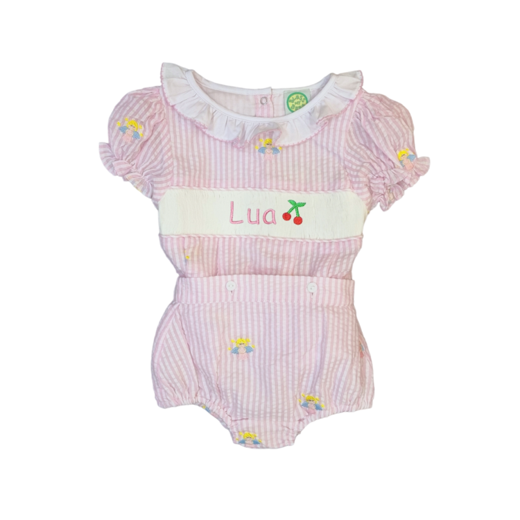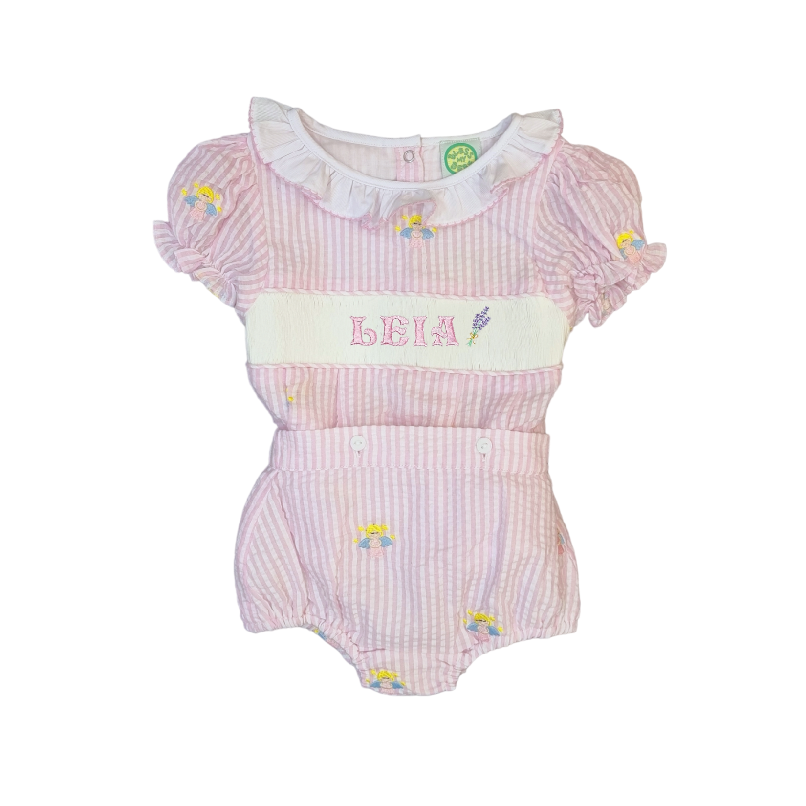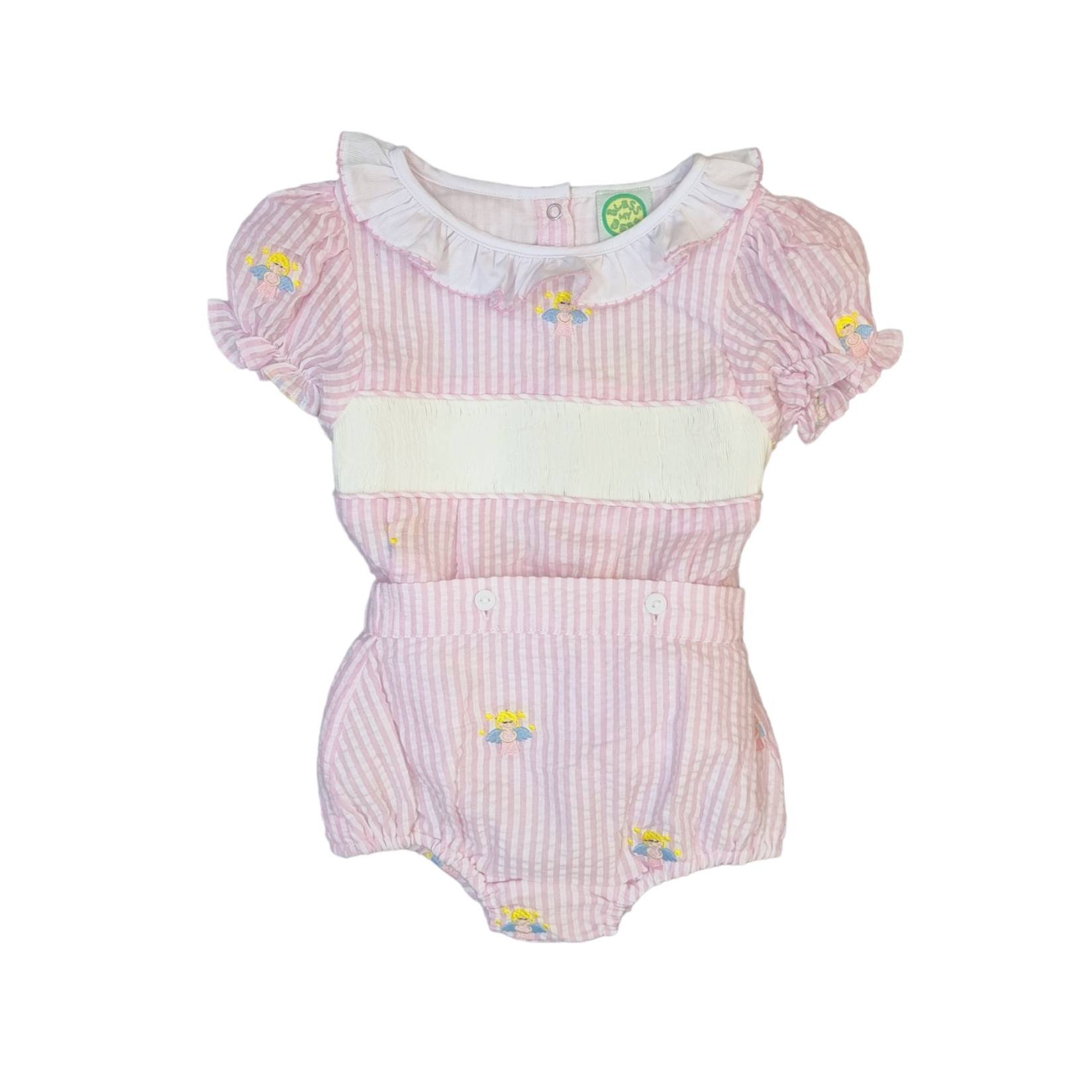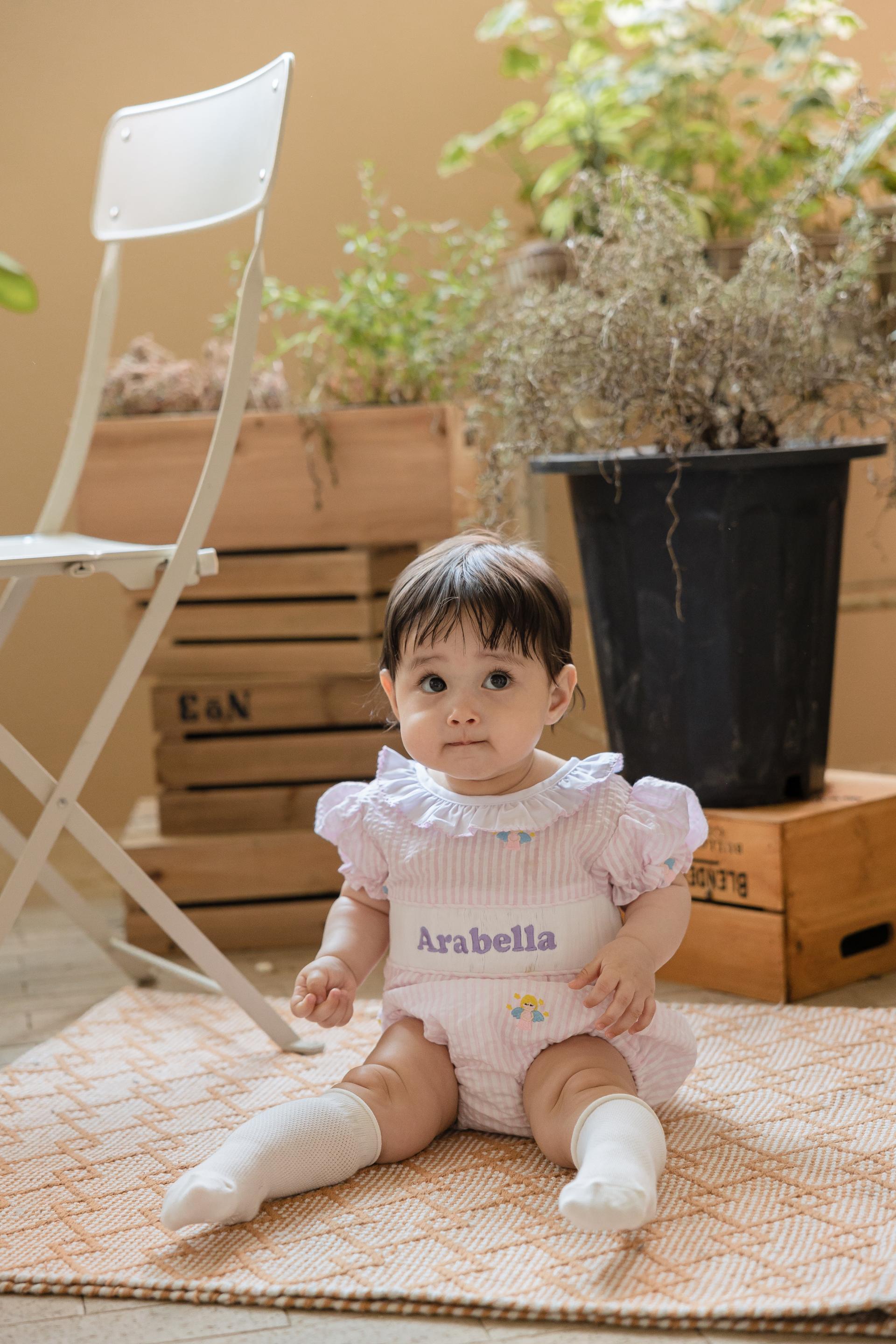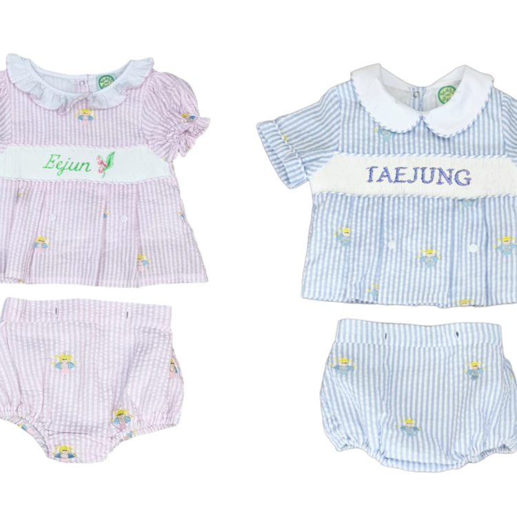 시원한 시어서커 소재이며, 핑크 스트라이프 패브릭에 사랑스러운 핑크 천사들이 자수 되어 있습니다. 상의와 하의를 잇는 단추가 있어 움직여도 윗옷이 빠지지 않으며, 단추를 채우지 않고 입히면 원피스처럼 보이는 제품입니다. 상의 가슴 부분인 하얀 스모크 부분에 아이의 이름 혹은 태명, 애칭 등을 수 놓으면 세상에 하나 뿐인 우리 아이만을 위한 꼬까옷이 완성됩니다 ^^