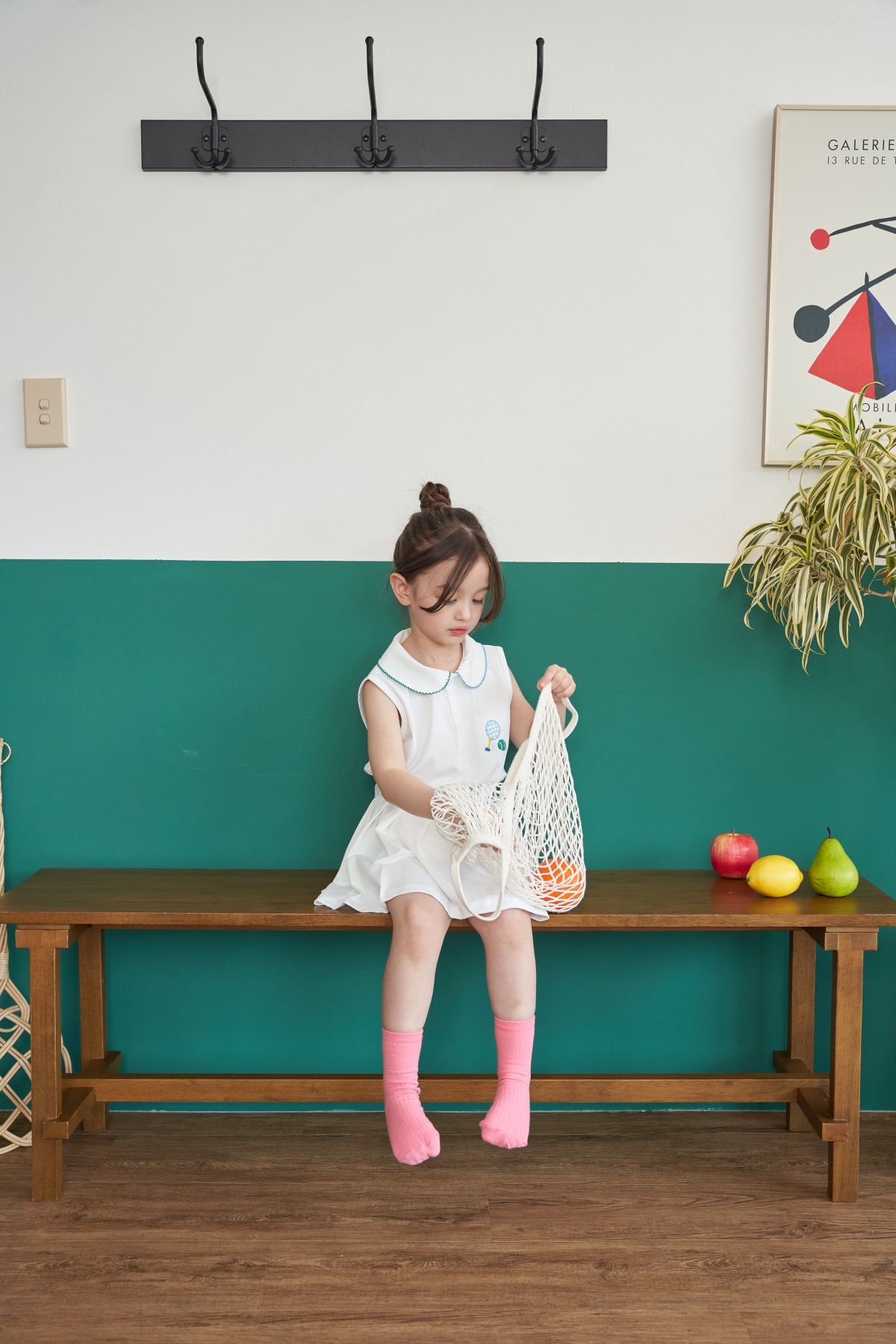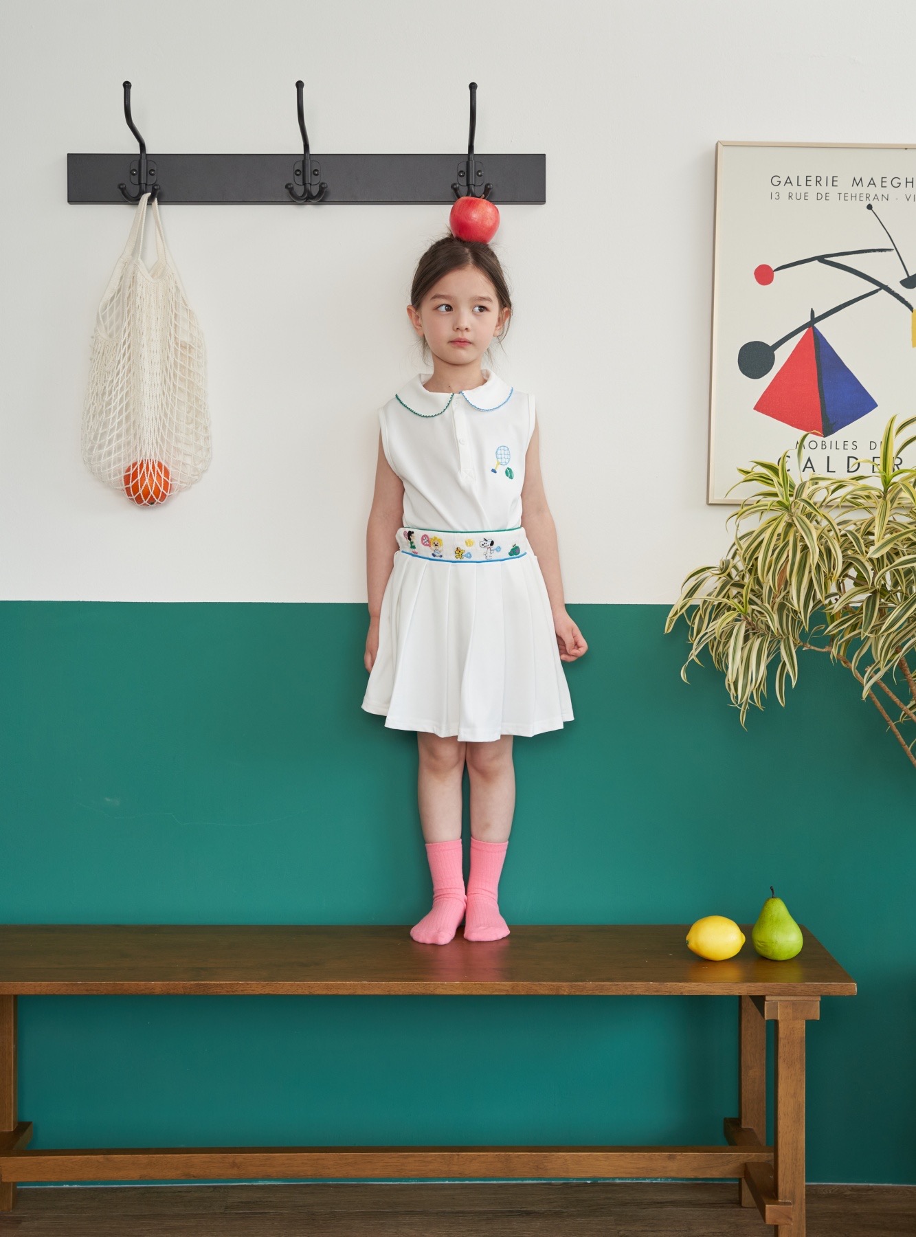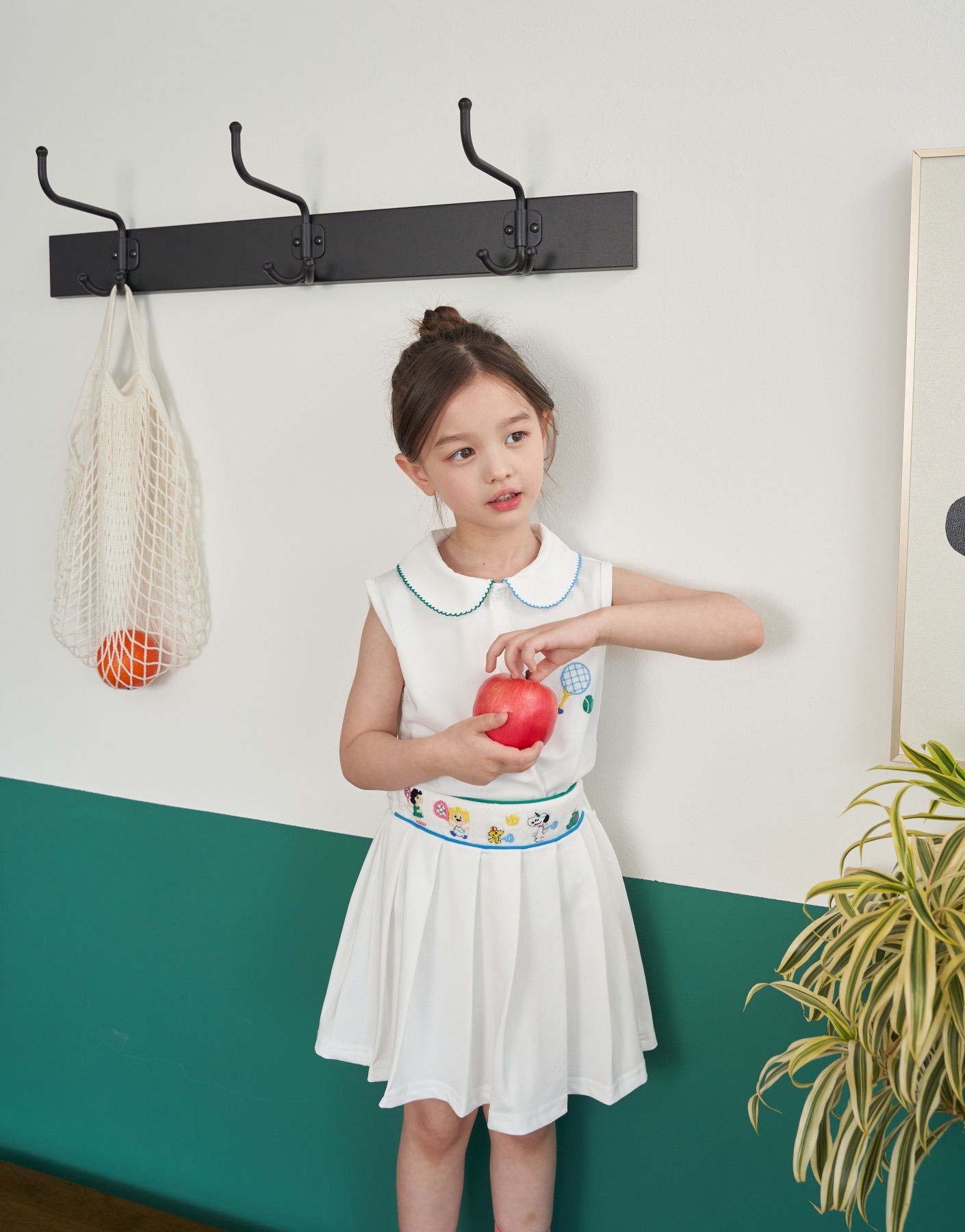 상의 - 시원한 화이트 패브릭에 귀여운 테니스 자수가 손자수로 정성스럽게 수 놓아져 있으며, 한 쪽 카라에는 블루 트리밍이, 반대편 카라에는 그린 트리밍으로 더욱 유닉함을 더하였습니다.