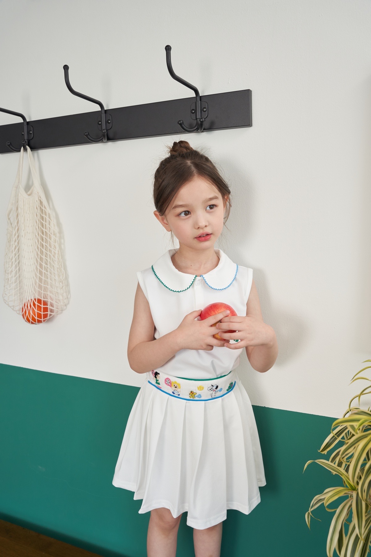 하의 - 허리부분이 스모크로 되어 있으며 테니스를 치는 스누피와 친구들이 사랑스럽게 손자수로 수 놓아져 있습니다. 허리 안쪽은 사이즈를 늘리고 줄일 수 있는 밴딩 처리가 되어 있어 아이들의 몸에 더욱 잘 맞을 수 있도록 하였습니다. 또한 스커트 안에 속반바지를 만들어 활동성을 높였습니다.