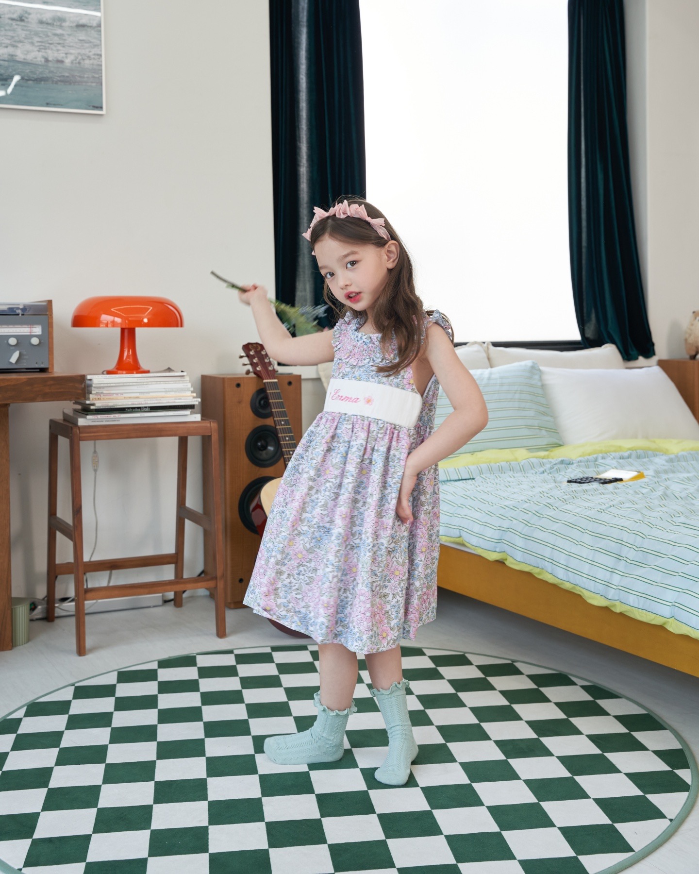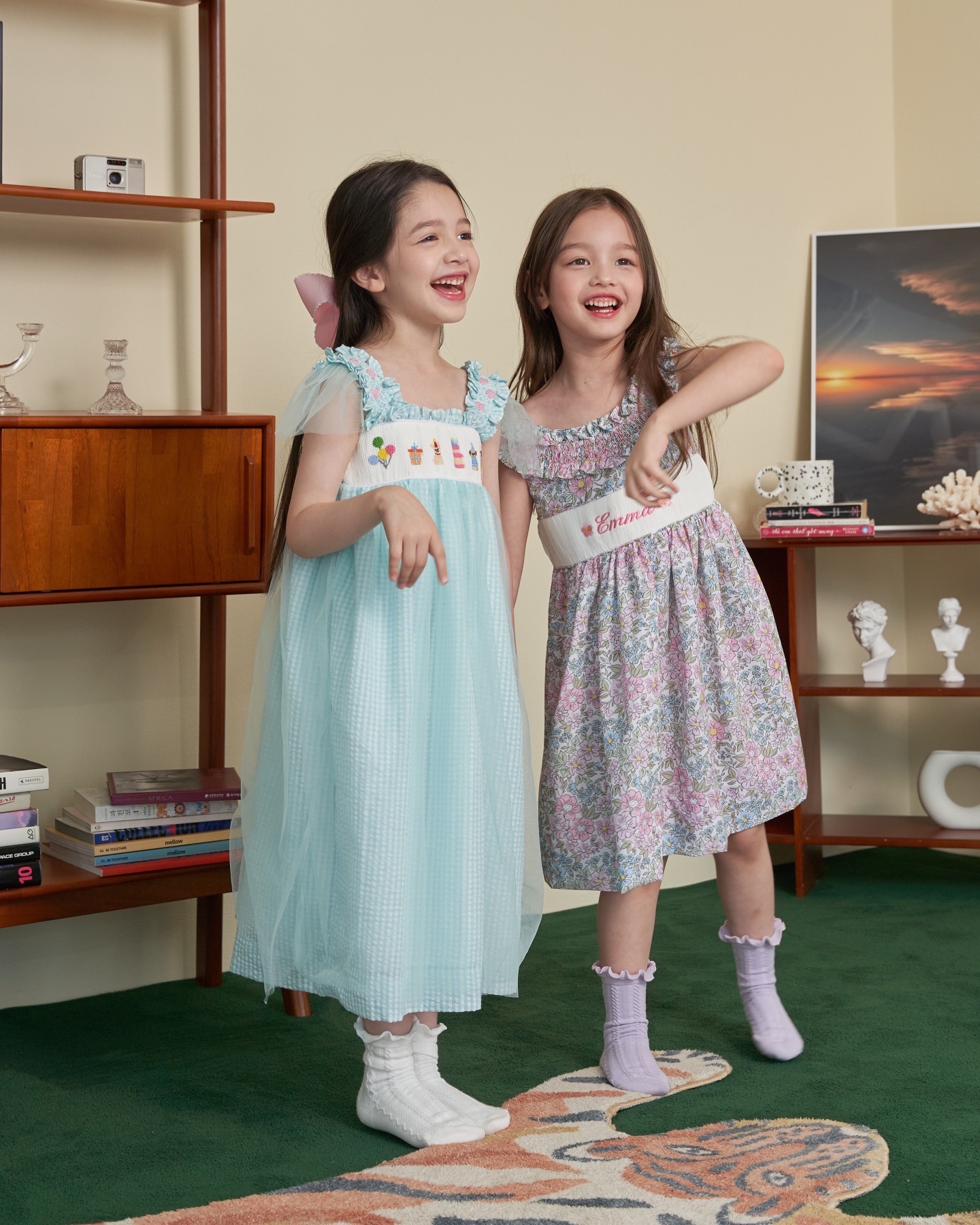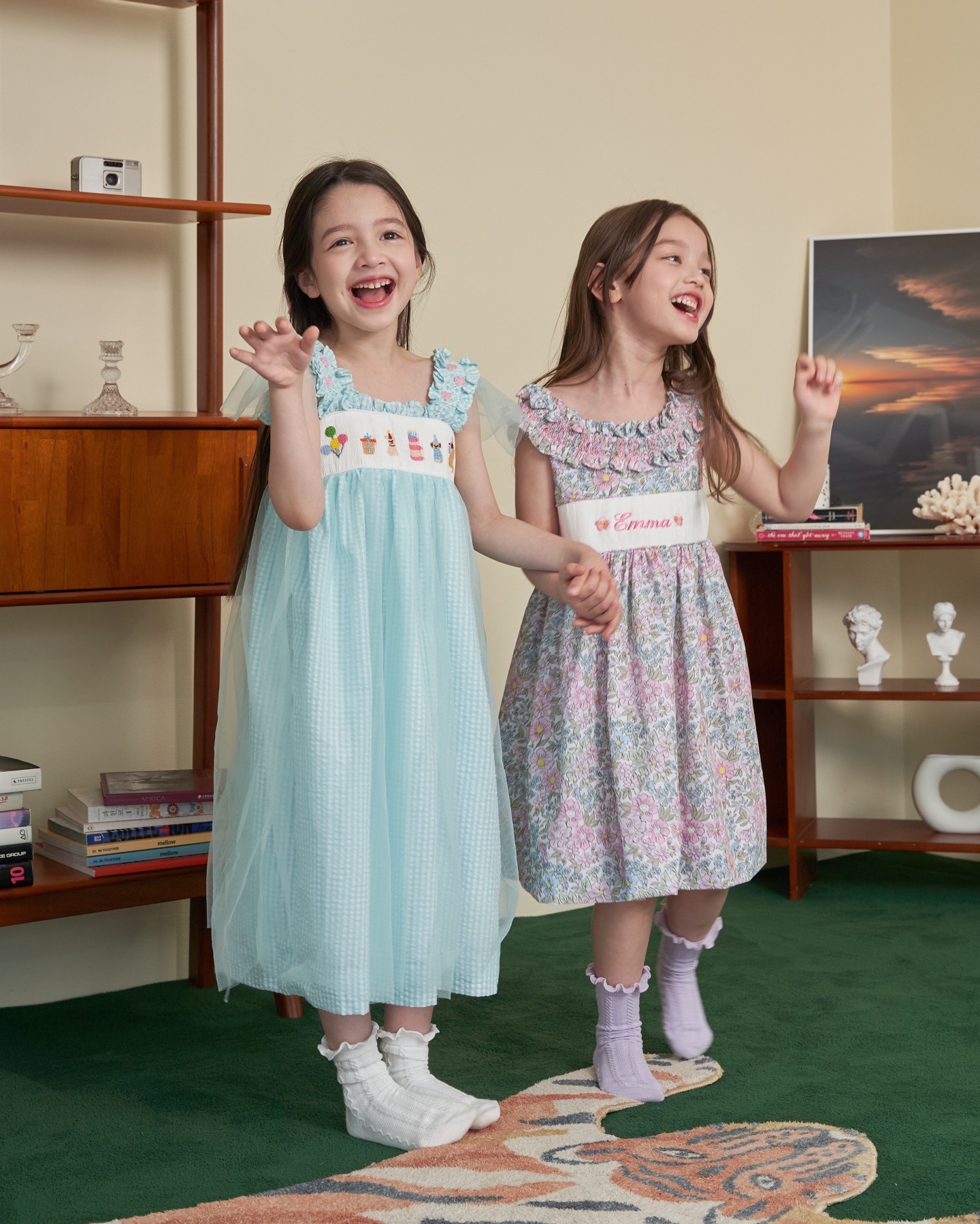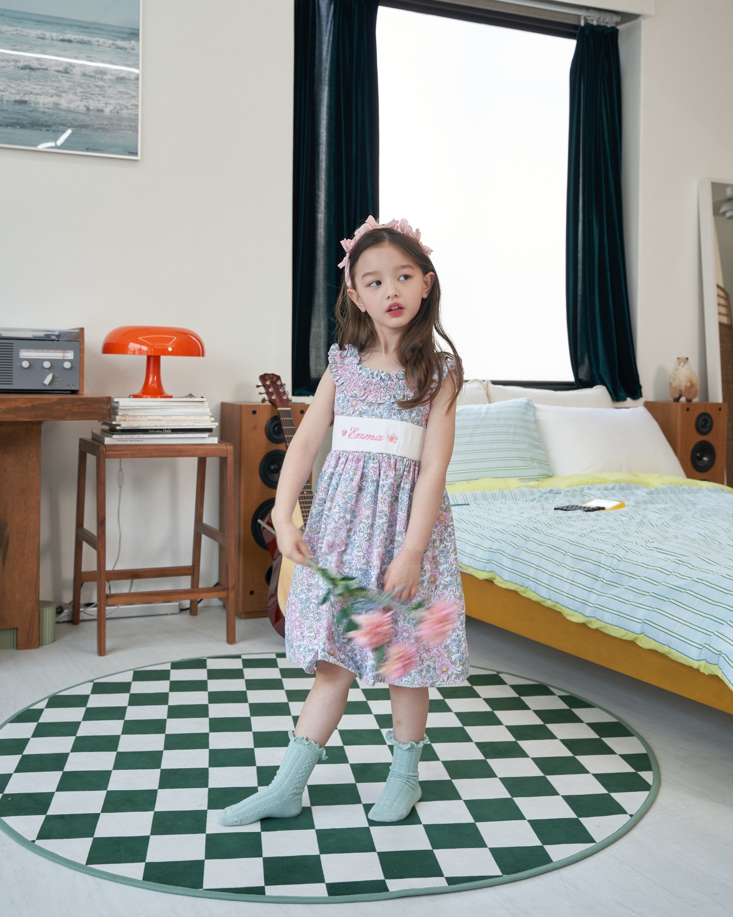 핑크와 블루가 어울러진 플로럴 패턴으로 라운드 넥 부분을 스모크로 제작하여 고급스러움을 더하였습니다. 가슴 부분의 스모크 부분에는 아이의 이름, 별명 혹은 애칭 등을 새길 수 있습니다.
