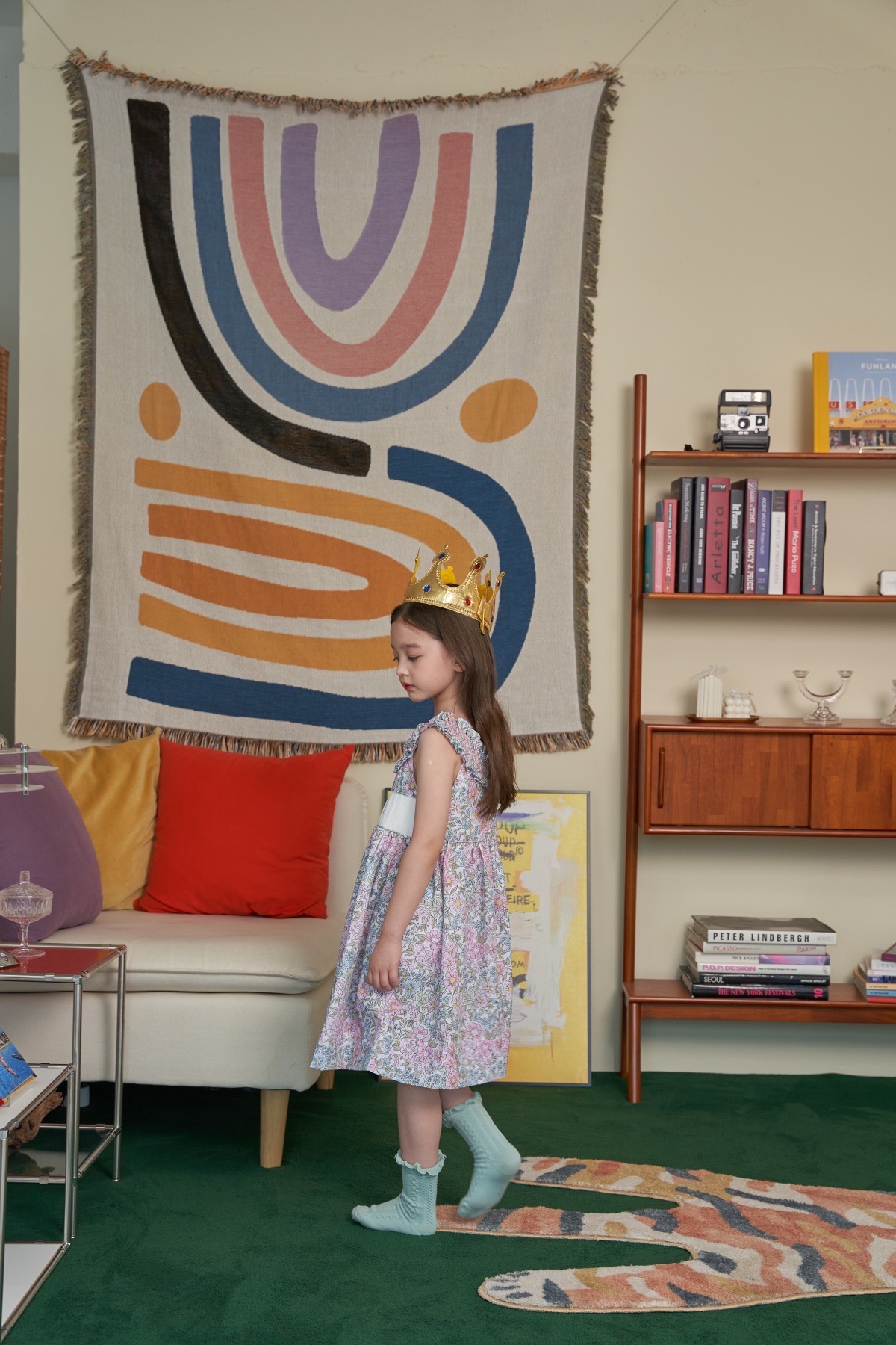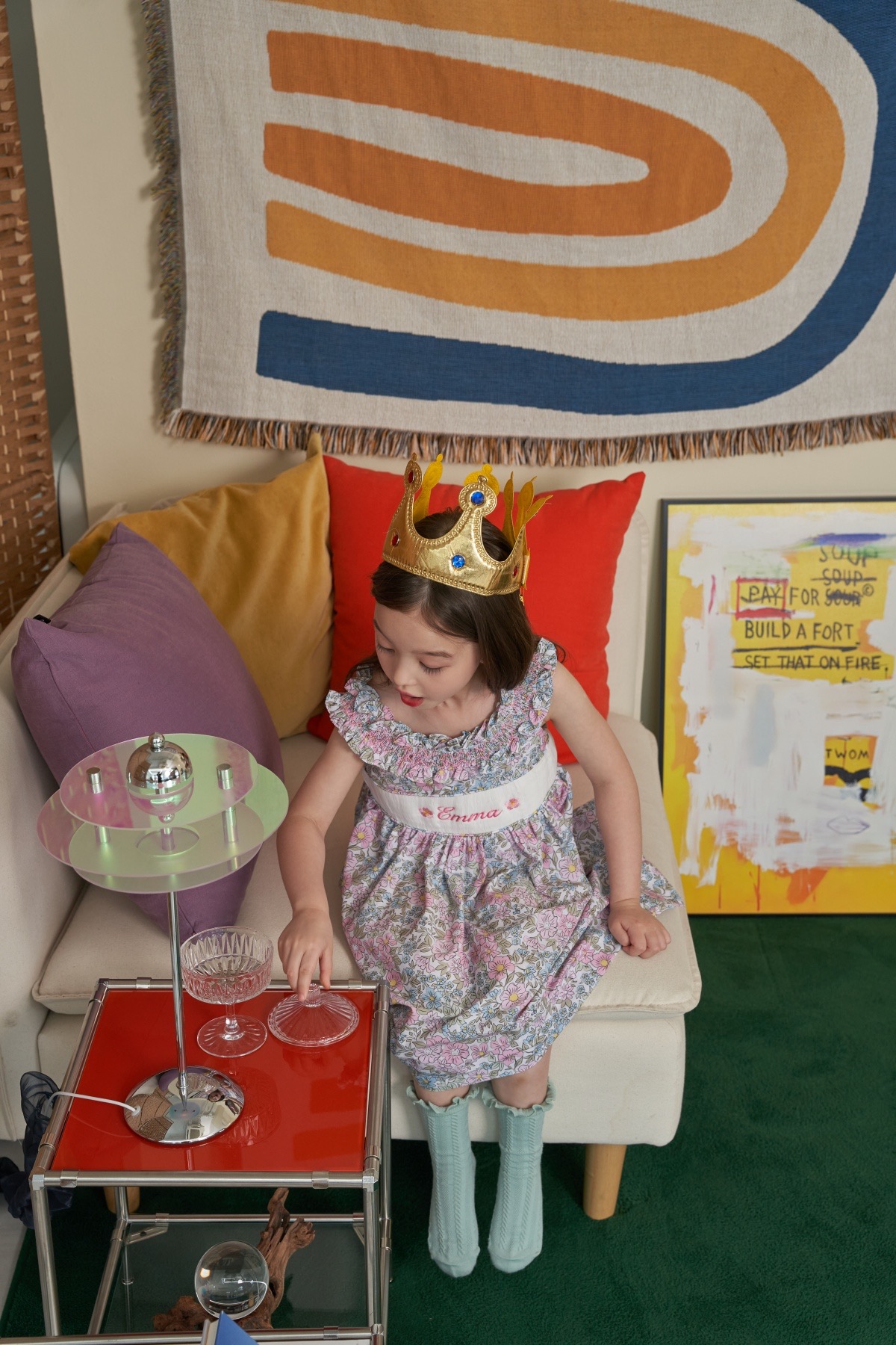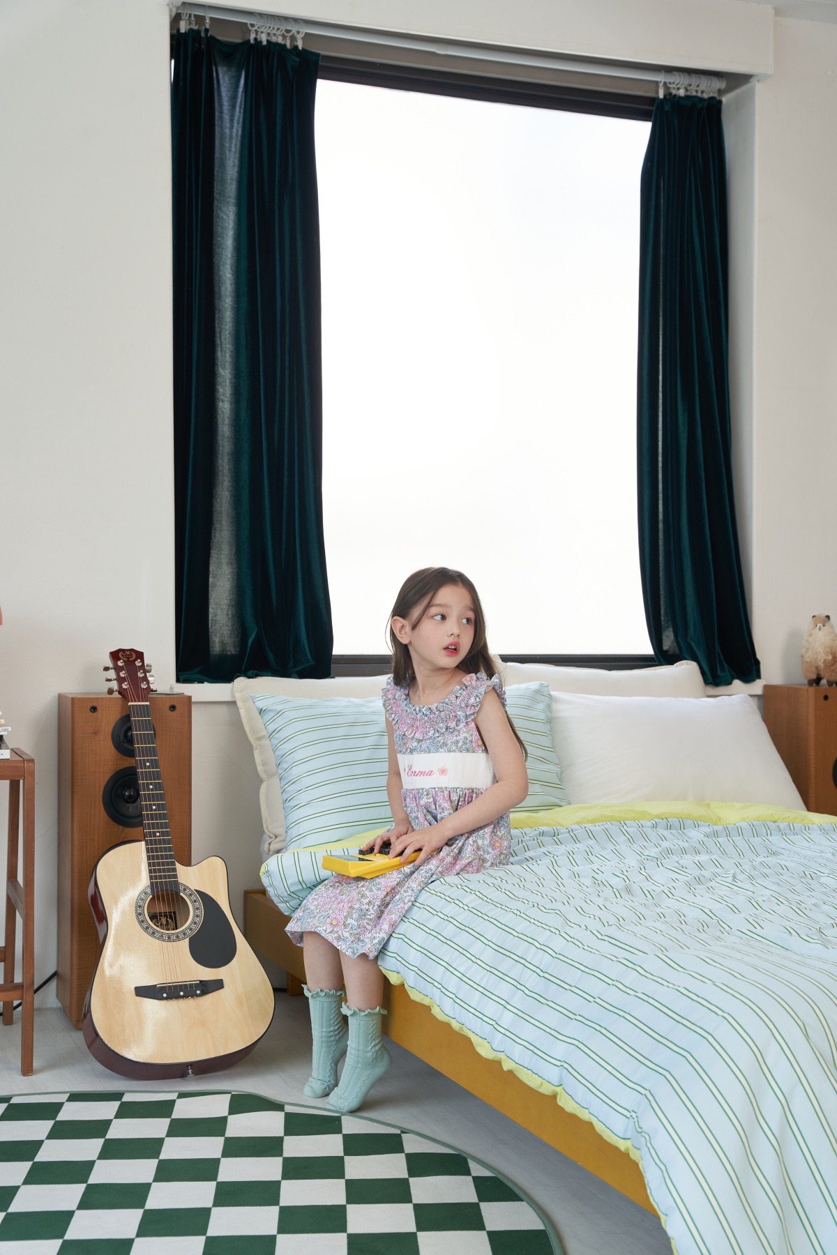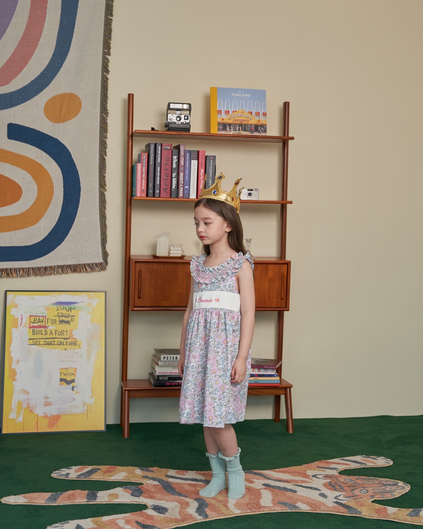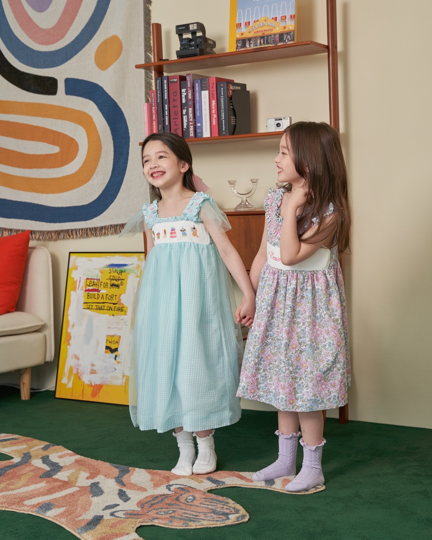 핑크와 블루가 어울러진 플로럴 패턴으로 라운드 넥 부분을 스모크로 제작하여 고급스러움을 더하였습니다. 가슴 부분의 스모크 부분에는 아이의 이름, 별명 혹은 애칭 등을 새길 수 있습니다.