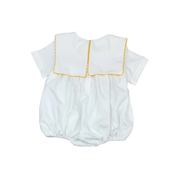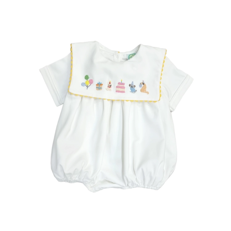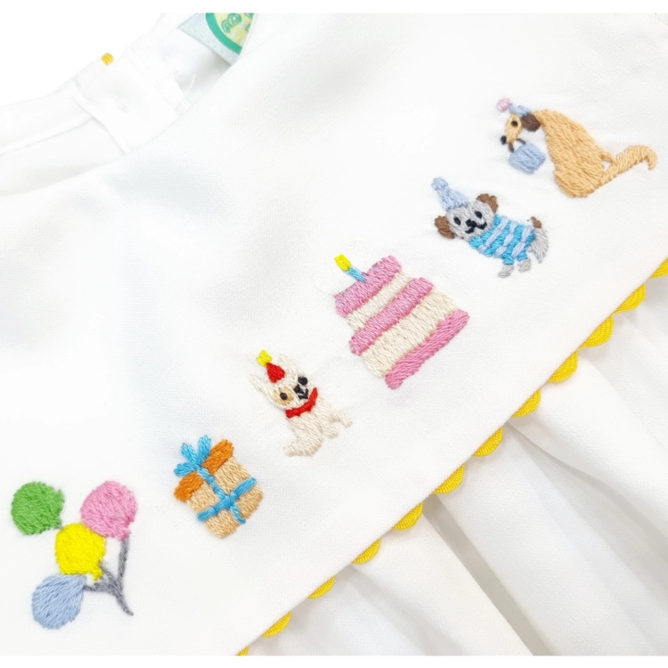 화이트 린넨 소재로 촉감이 시원하며, 아기의 소중한 기념일을 축하하는 바디수트입니다. 파티에 가장 잘 어울리는 화이트 색상에, 귀여운 강아지들이 아기의 기념일을 준비하고 축하해주는 손자수가 정성스럽게 수 놓아져 있습니다