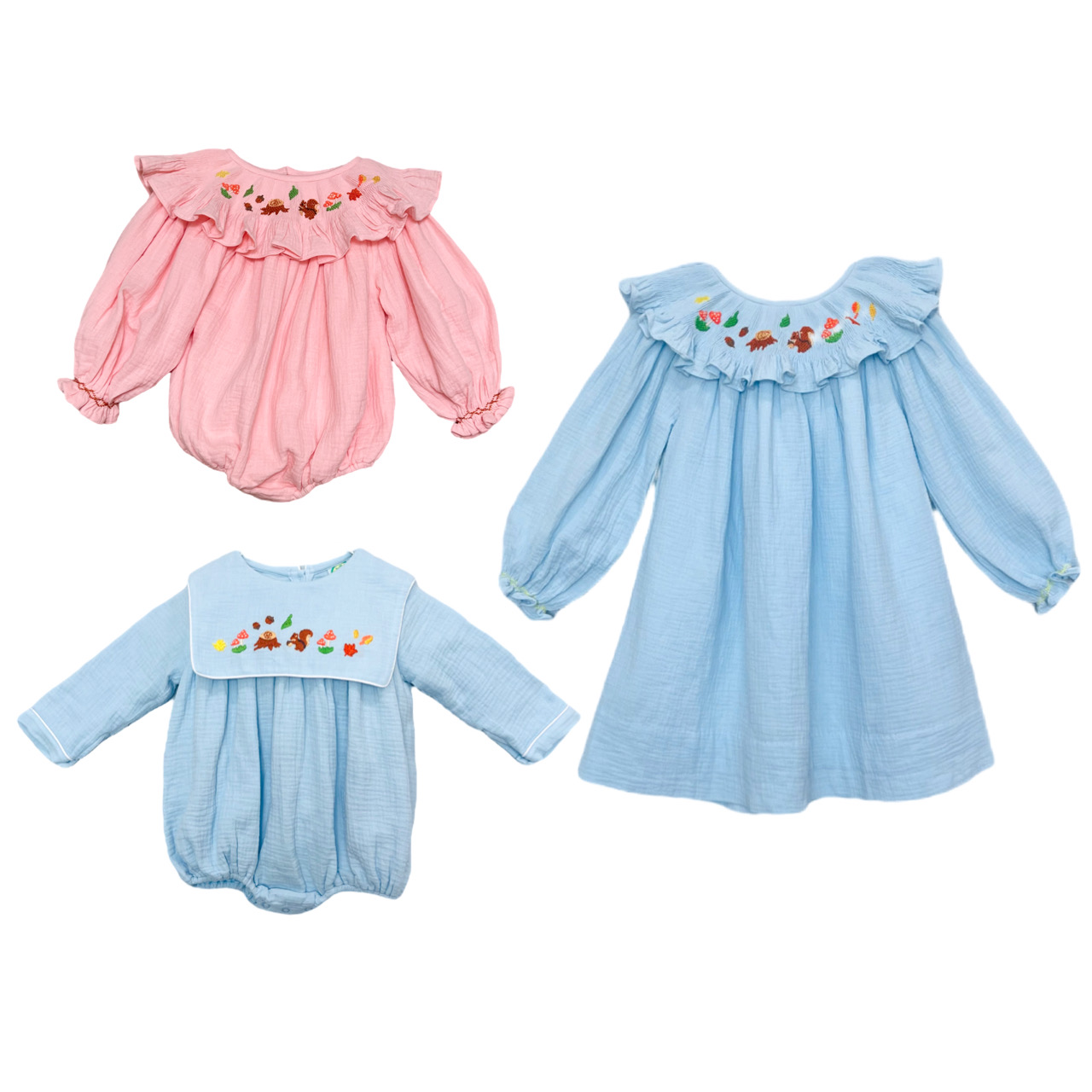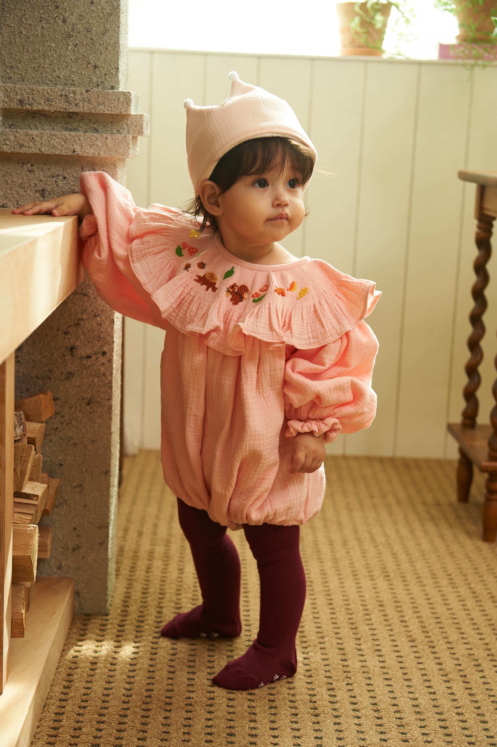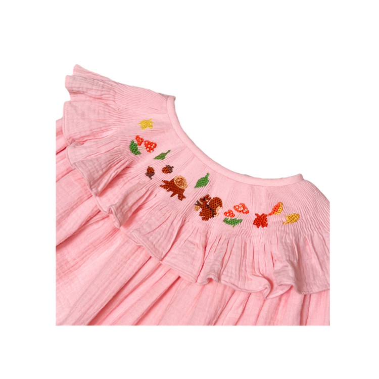 편안하고 고급스런 pink muslin 패브릭에 귀엽고 평화로운 자수들이 수놓아져 있습니다. 주머니가 있어 실용적이며, 목 주변의 스모크 칼라에는 버섯과 낙엽들 그리고 다람쥐와 나무가 한 땀 한 땀 손자수로 정성스럽게 수 놓아져 있습니다.