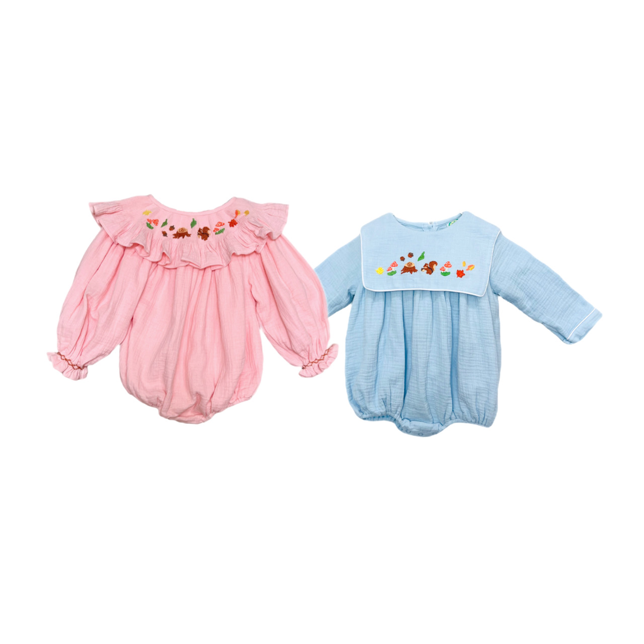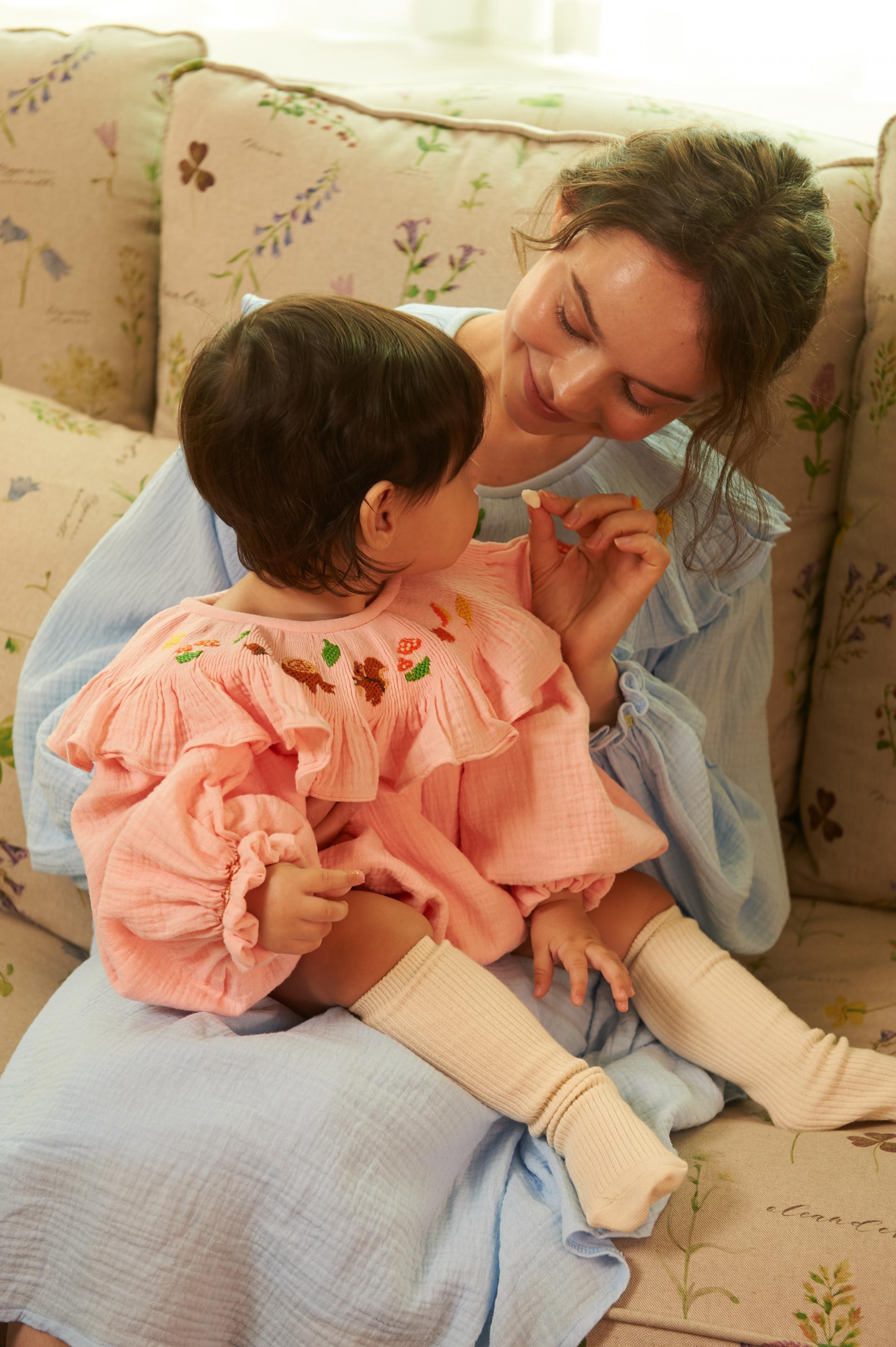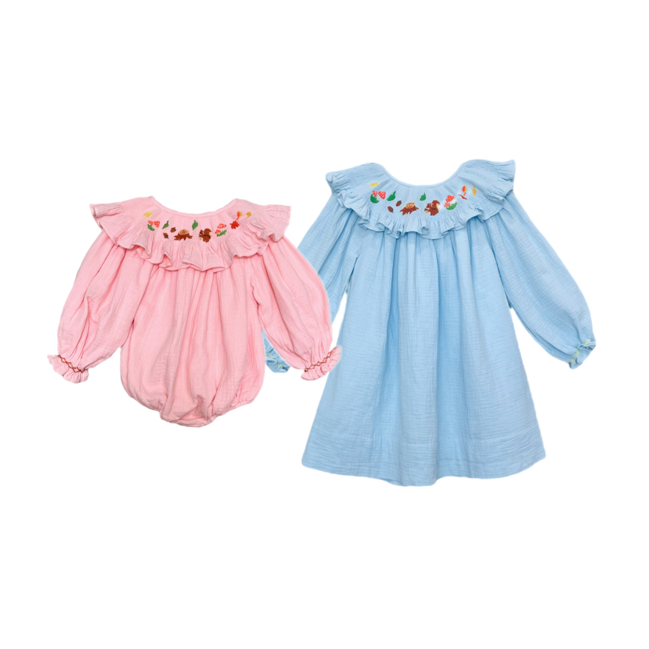 편안하고 고급스런 pink muslin 패브릭에 귀엽고 평화로운 자수들이 수놓아져 있습니다. 주머니가 있어 실용적이며, 목 주변의 스모크 칼라에는 버섯과 낙엽들 그리고 다람쥐와 나무가 한 땀 한 땀 손자수로 정성스럽게 수 놓아져 있습니다.