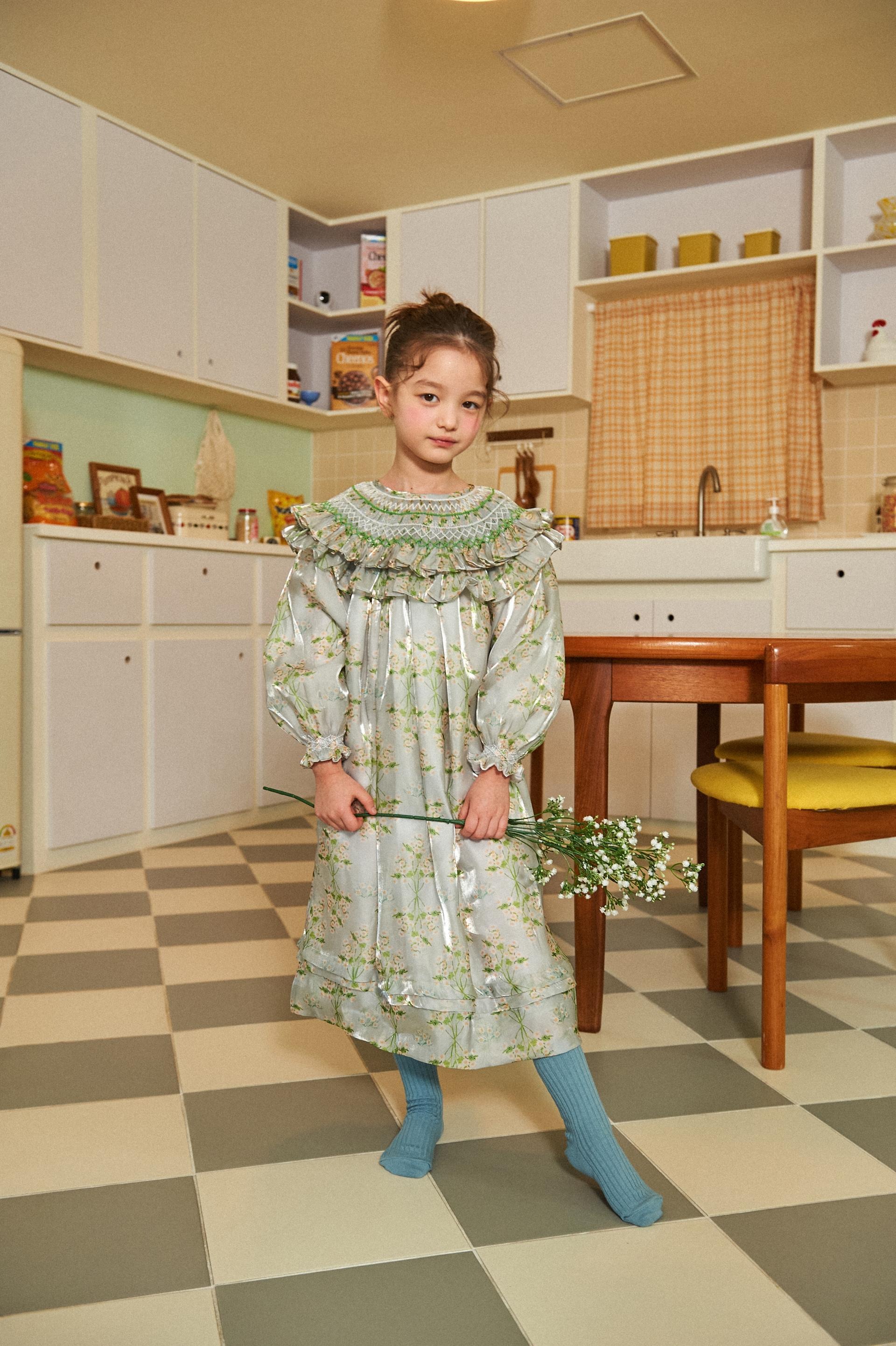 은은하게 빛나는 쉬폰 소재에 꽃들이 그려진 고급스런 패브릭으로 드레시하고 주인공 느낌이 물씬 나는 드레스입니다. 목 주변은 스모크가 되어있고 그 위는 손자수로 수놓아져 있으며, 카라형식으로 가디건과 매치해도 예쁘게 어울립니다. 또한 카라 끝이 이중 러플로 되어 있어 더욱 풍성해 보입니다.