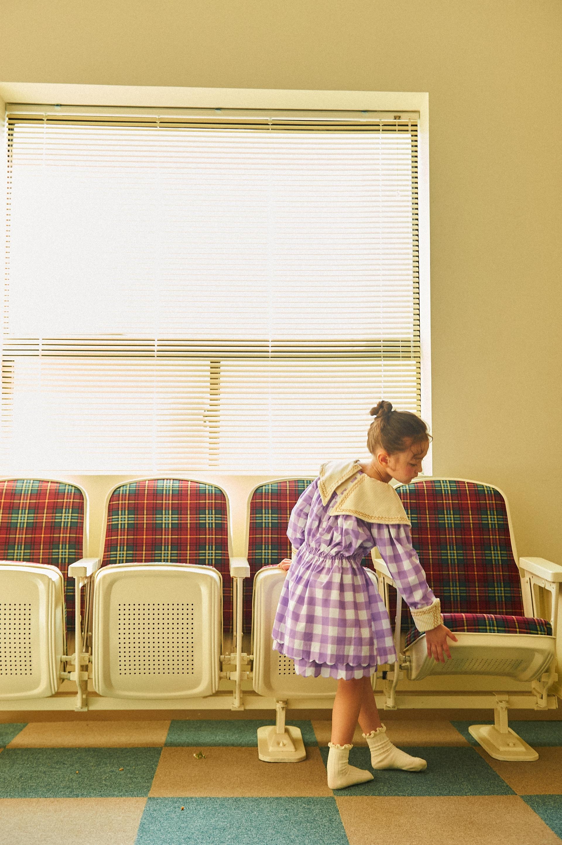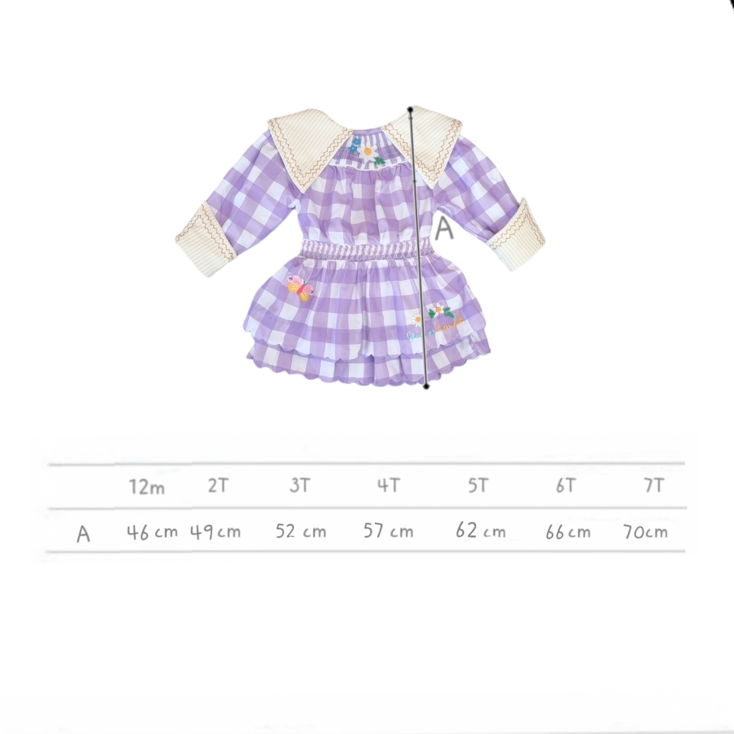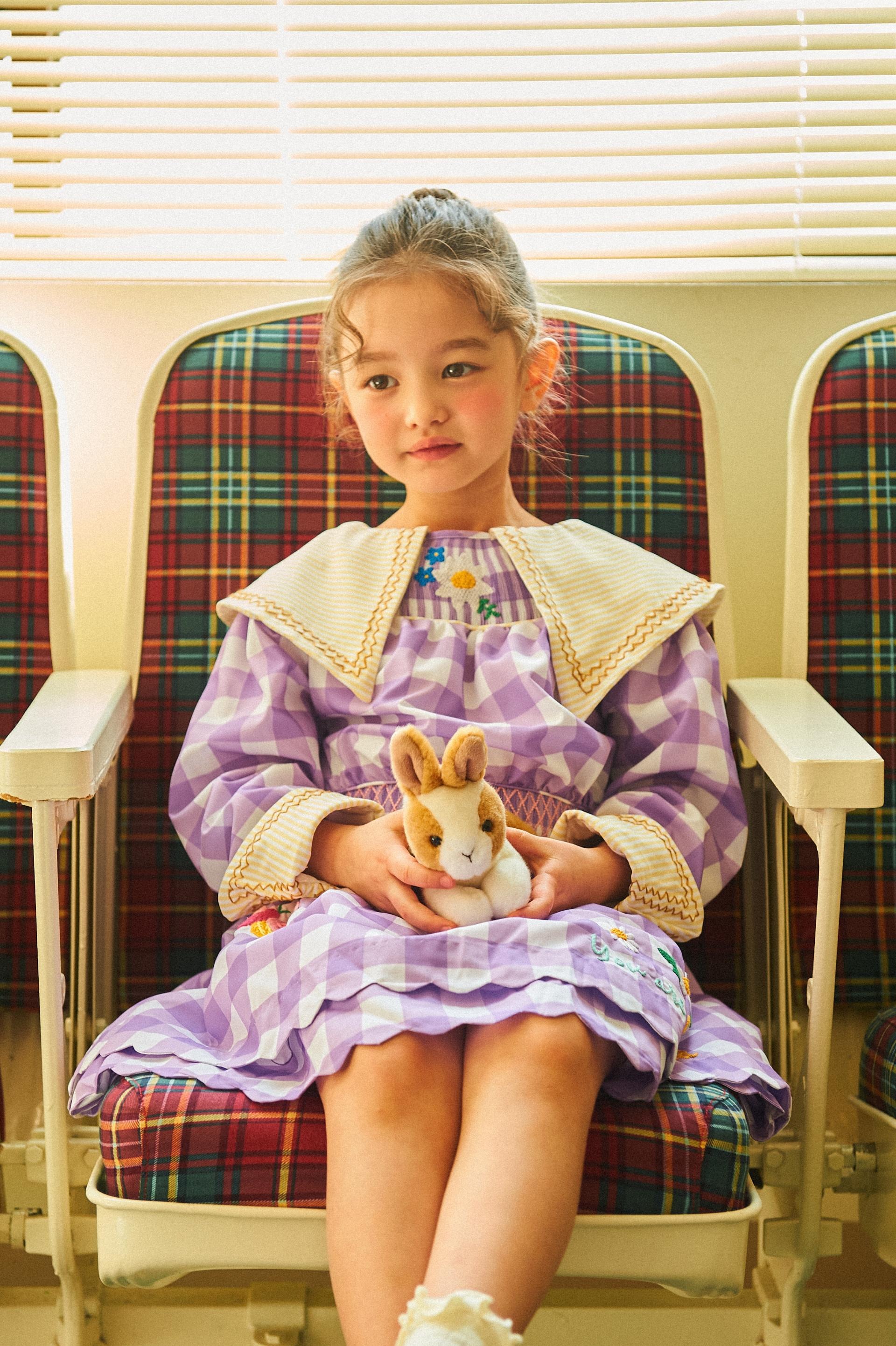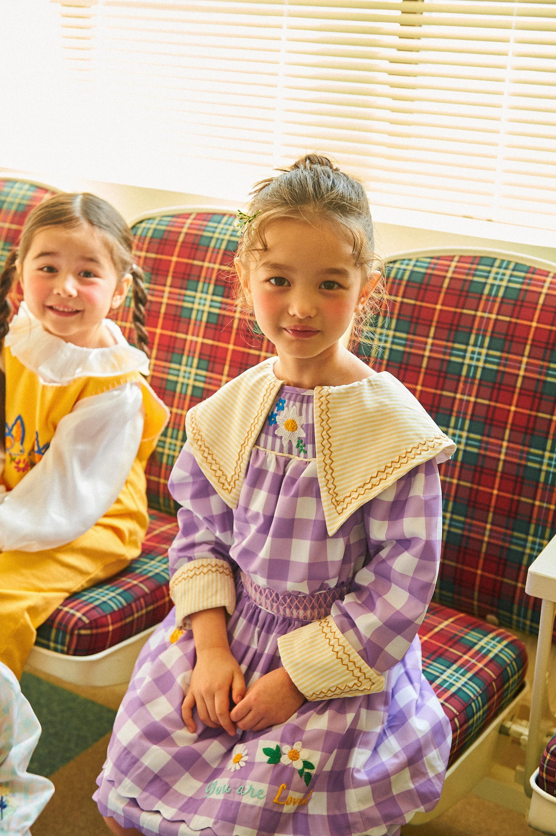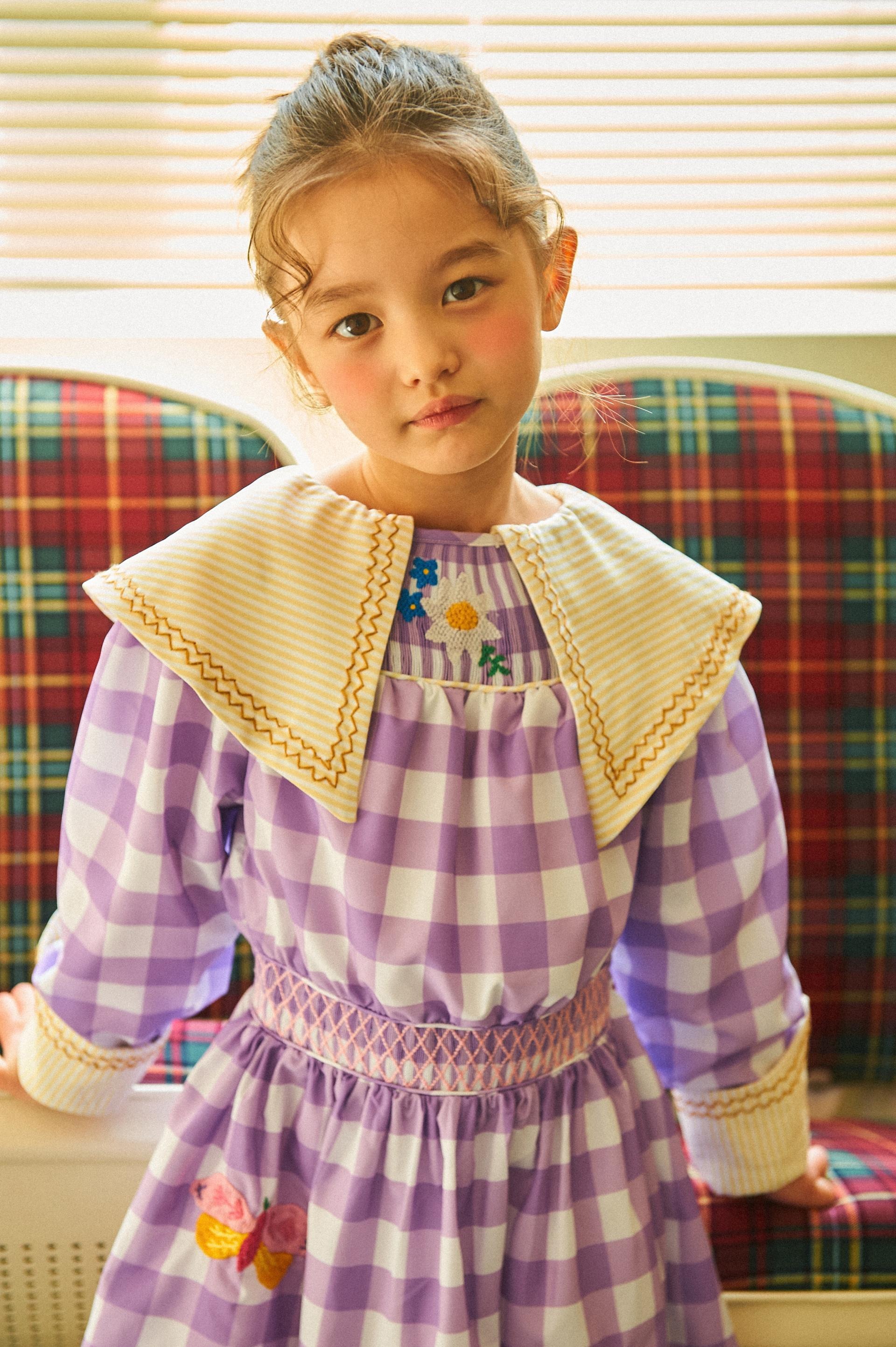 스트라이프 노랑과 버플 깅엄 체크의 사랑스런 조합의 제품으로 칼라와 소매와 끝에는 지그재그 손자수가 정성스럽게 손자수로 수 놓아져 있습니다.