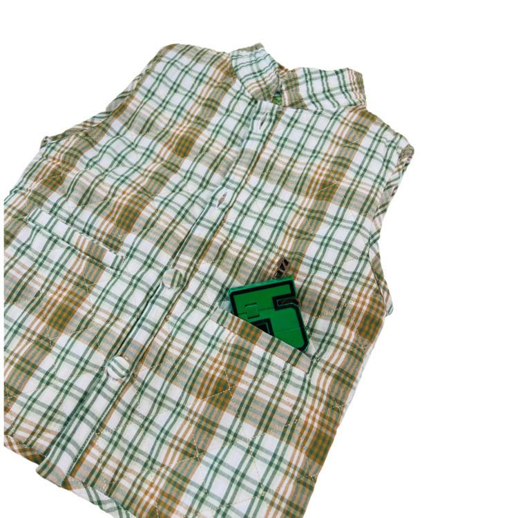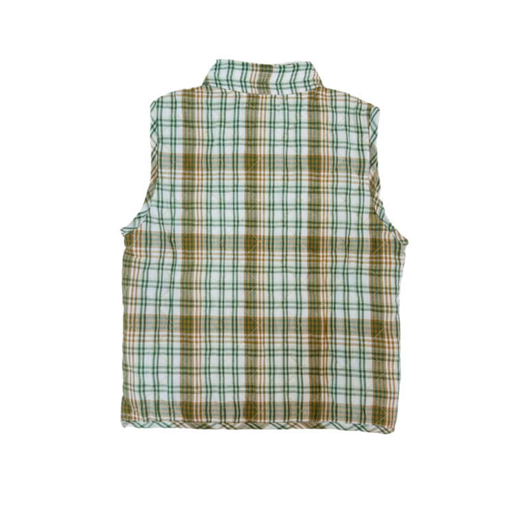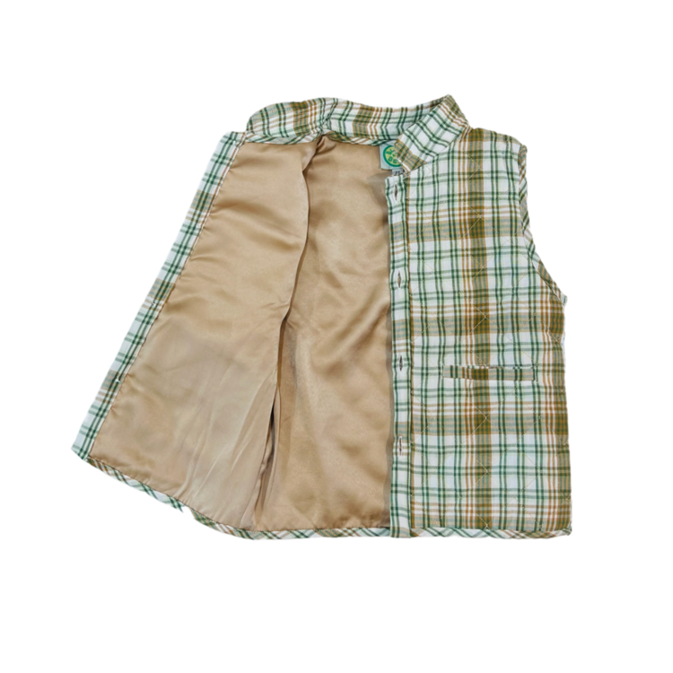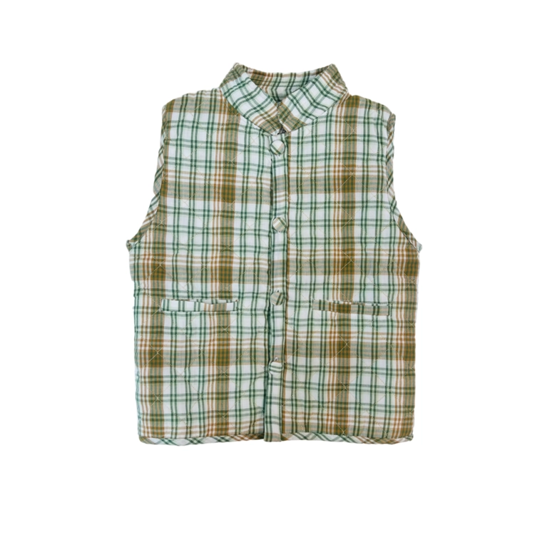화이트 바탕에 다크 그린과 브라운의 플레이드 체크 패브릭으로 조끼 전체가 퀼팅된 제품입니다. 안감으로 브라운 새틴을 사용하여 전체적으로 고급스러움을 더하였으며 두께가 두껍지 않아 한겨울에도 코트 혹은 패딩 안에 함께 입을 수 있는 실용성 높은 제품입니다. 간절기에 반팔이나 긴팔과 함께 입혀주세요.